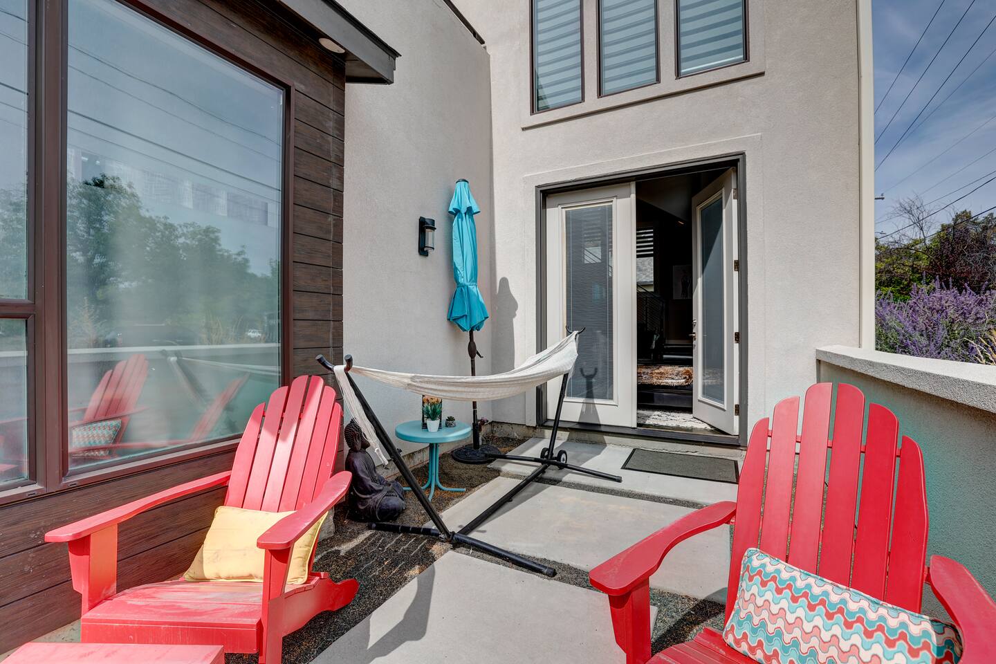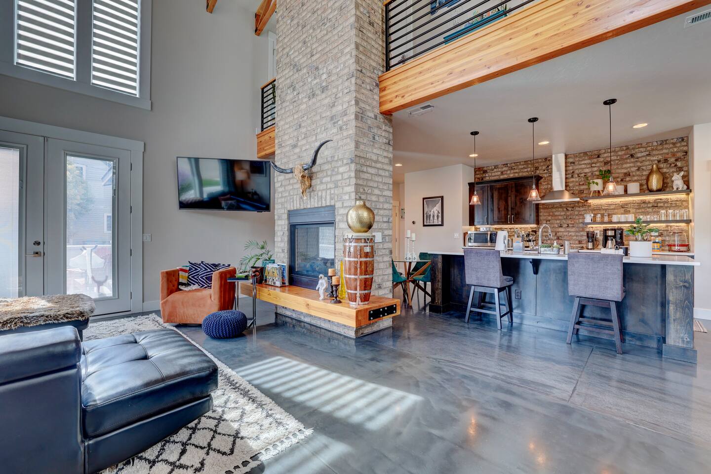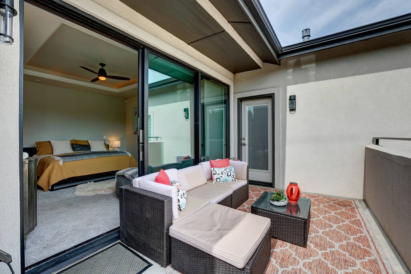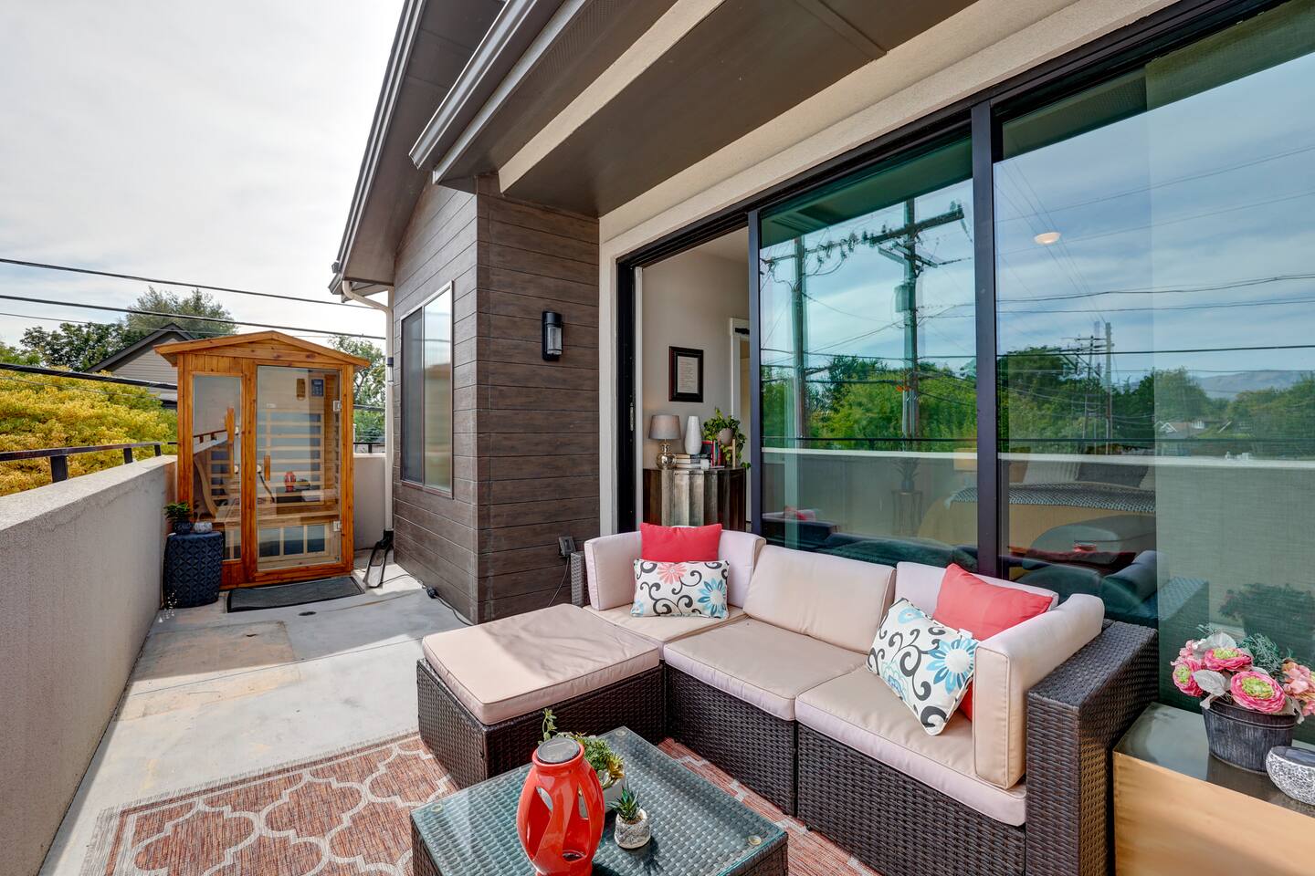 The Urban Retreat is a beautifully and thoughtfully designed and decorated home. The owner of the home lives here generally one to two months at a time so you can rest assured that this property has it all! It's a two story home with a patio on each level; the main level patio boasts a fireplace, and the second story, a sectional couch and sauna! Inside on the main level you'll be greeted with high ceilings and sweeping windows. From the the main entry area, you'll see the living room, a small library of books and games, the fully stocked kitchen, and the dining area. Also on the main level is a powder bathroom and fireplace. Up the flight of stairs are two bedrooms, both ensuite. The first bedroom you come to is a double bed, and the main bedroom down the hall is a king bed. Enjoy your time on either patio and make sure you help yourself to the sauna!