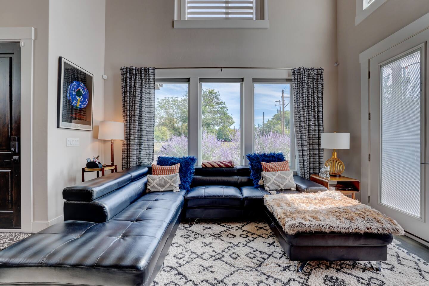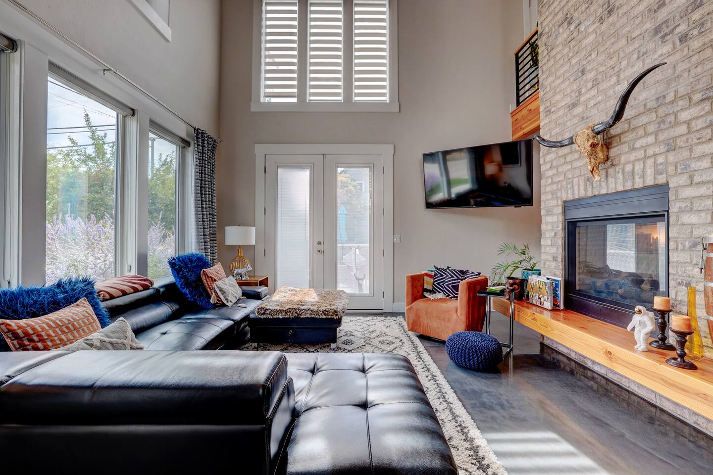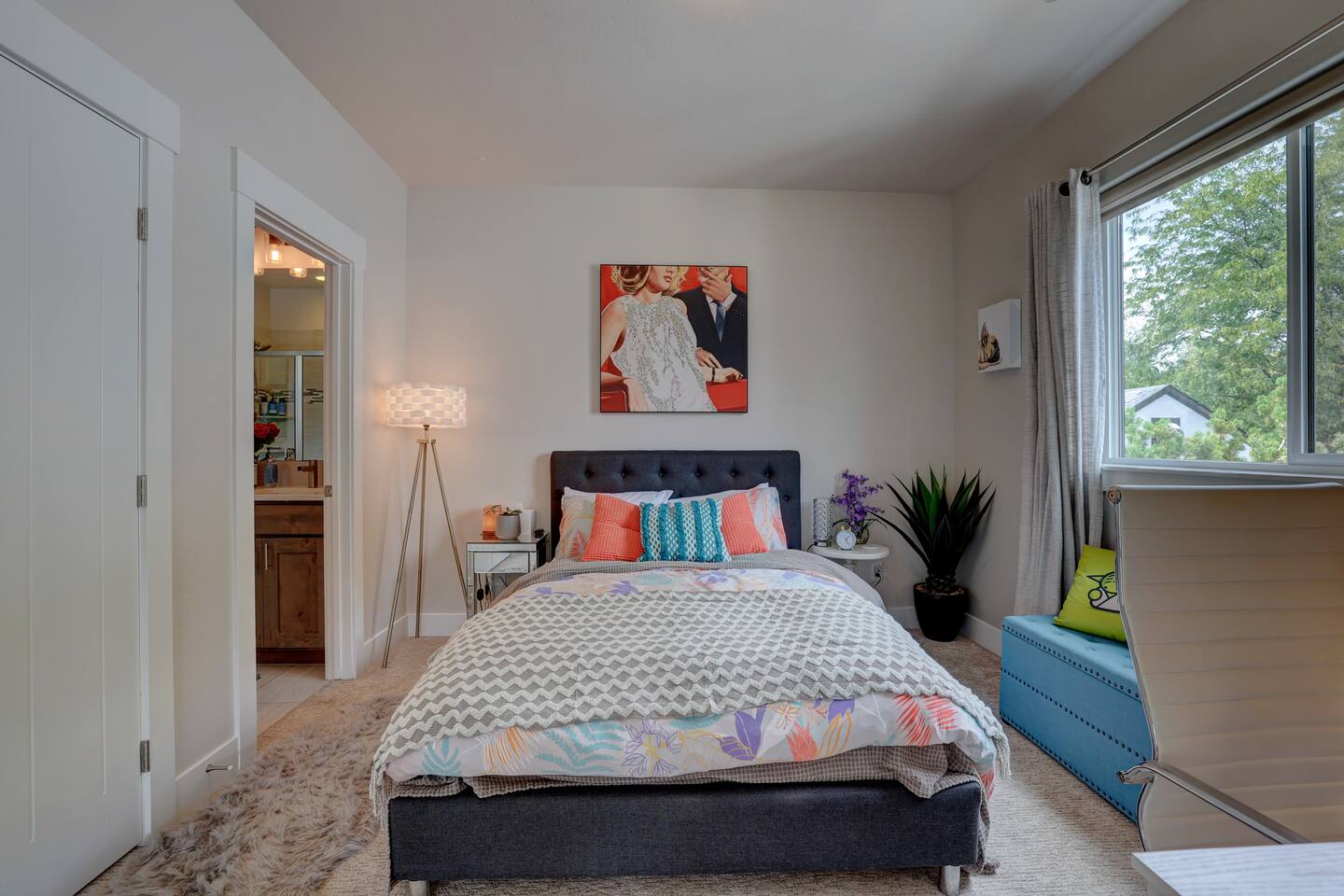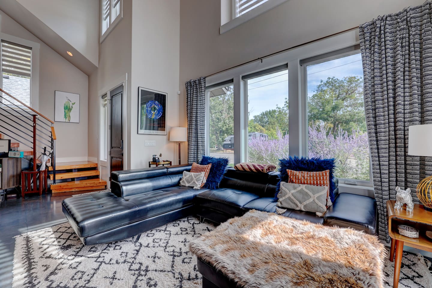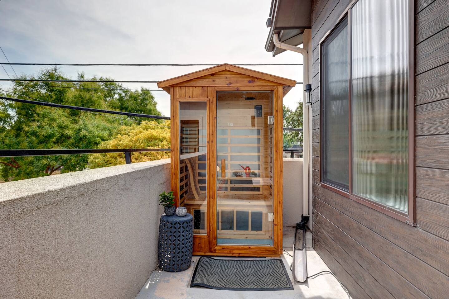 The Urban Retreat is a beautifully and thoughtfully designed and decorated home. The owner of the home lives here generally one to two months at a time so you can rest assured that this property has it all! It's a two story home with a patio on each level; the main level patio boasts a fireplace, and the second story, a sectional couch and sauna! Inside on the main level you'll be greeted with high ceilings and sweeping windows. From the the main entry area, you'll see the living room, a small library of books and games, the fully stocked kitchen, and the dining area. Also on the main level is a powder bathroom and fireplace. Up the flight of stairs are two bedrooms, both ensuite. The first bedroom you come to is a double bed, and the main bedroom down the hall is a king bed. Enjoy your time on either patio and make sure you help yourself to the sauna!