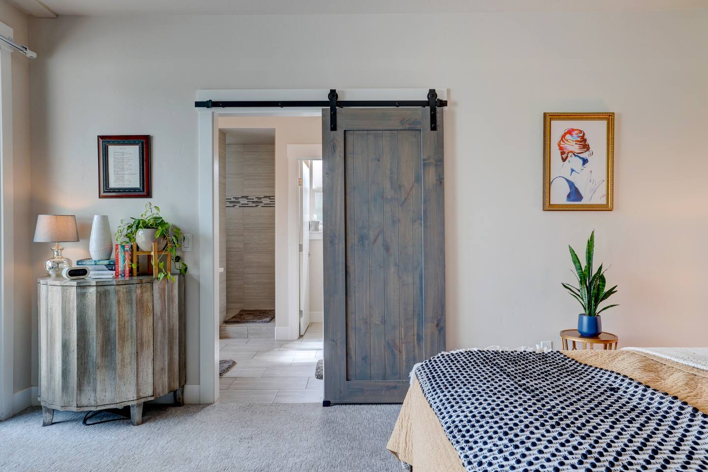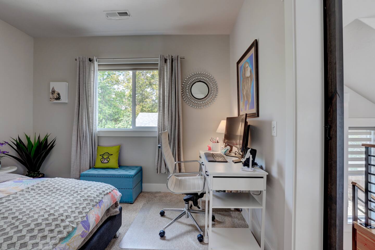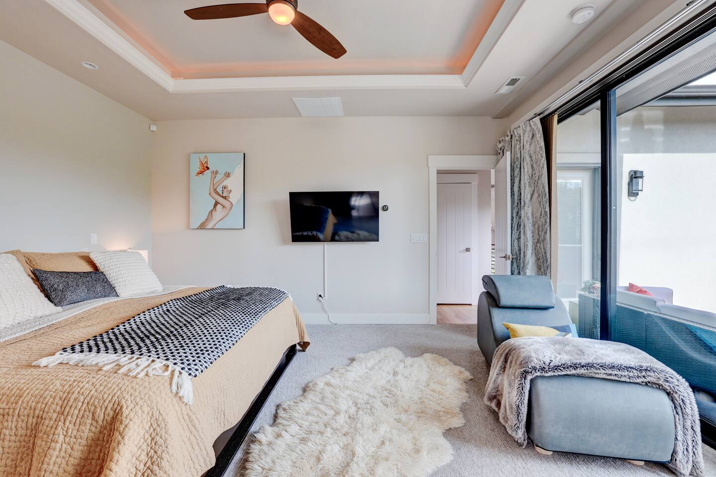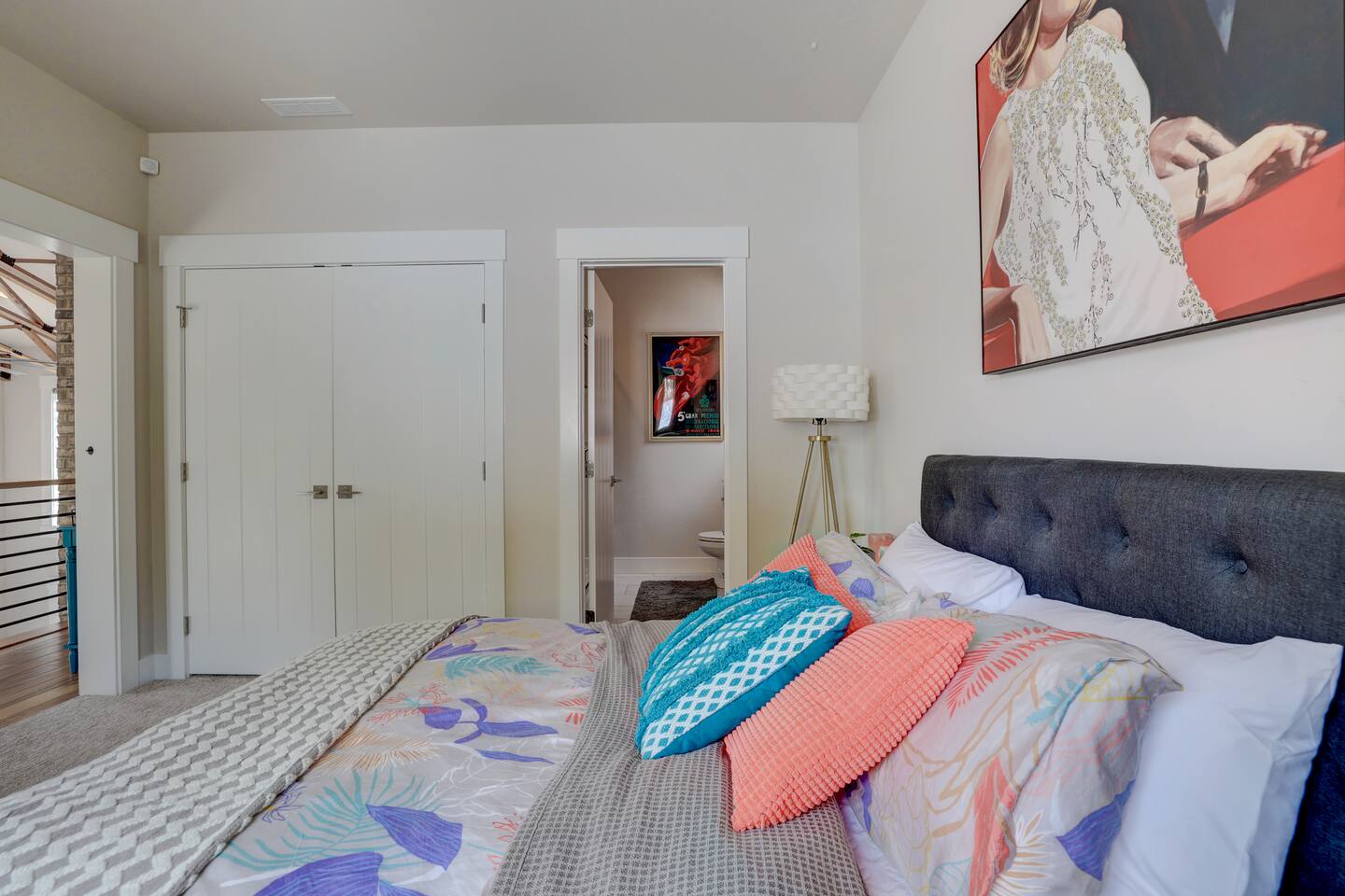 The Urban Retreat is a beautifully and thoughtfully designed and decorated home. The owner of the home lives here generally one to two months at a time so you can rest assured that this property has it all! It's a two story home with a patio on each level; the main level patio boasts a fireplace, and the second story, a sectional couch and sauna! Inside on the main level you'll be greeted with high ceilings and sweeping windows. From the the main entry area, you'll see the living room, a small library of books and games, the fully stocked kitchen, and the dining area. Also on the main level is a powder bathroom and fireplace. Up the flight of stairs are two bedrooms, both ensuite. The first bedroom you come to is a double bed, and the main bedroom down the hall is a king bed. Enjoy your time on either patio and make sure you help yourself to the sauna!