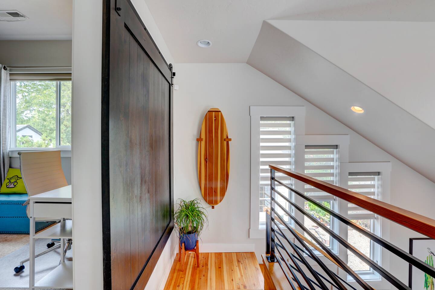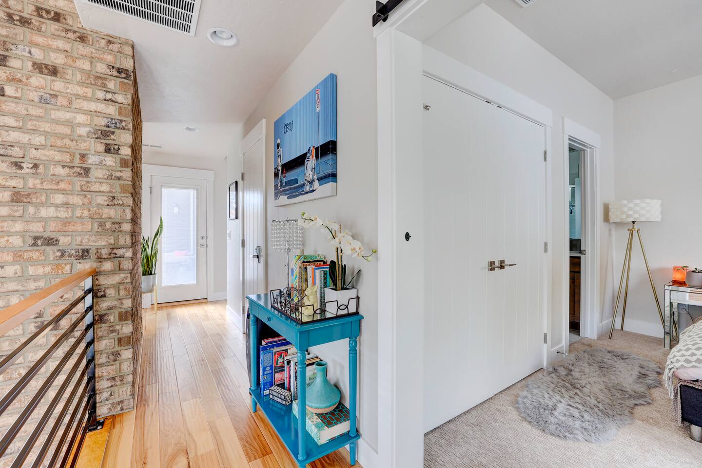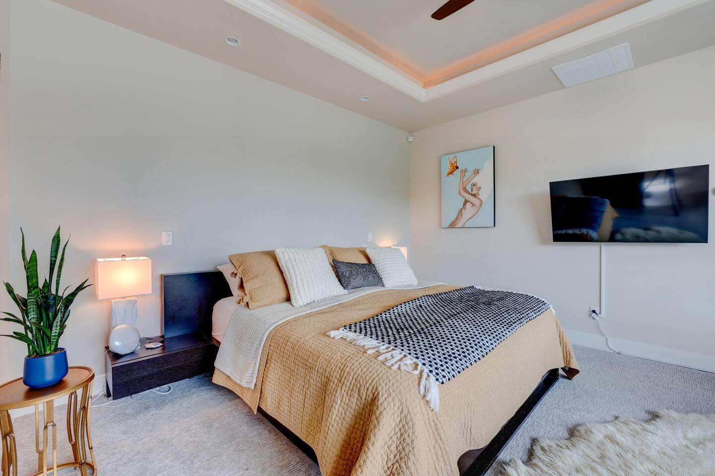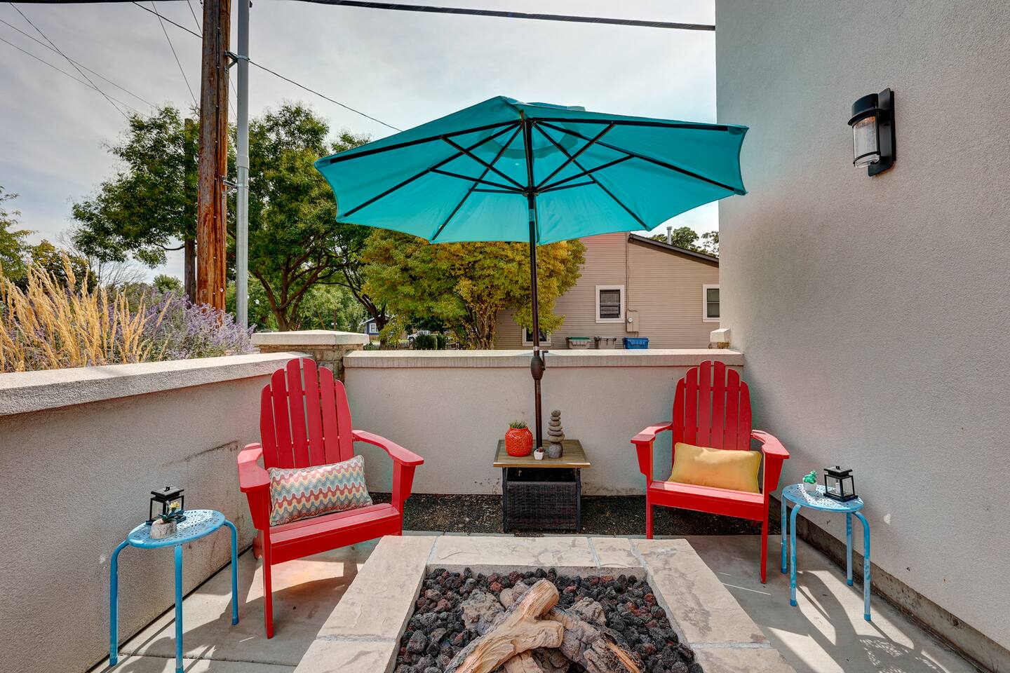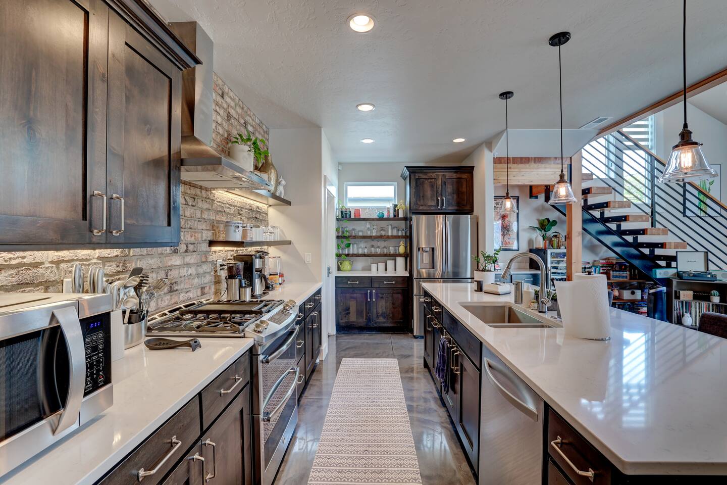 The Urban Retreat is a beautifully and thoughtfully designed and decorated home. The owner of the home lives here generally one to two months at a time so you can rest assured that this property has it all! It's a two story home with a patio on each level; the main level patio boasts a fireplace, and the second story, a sectional couch and sauna! Inside on the main level you'll be greeted with high ceilings and sweeping windows. From the the main entry area, you'll see the living room, a small library of books and games, the fully stocked kitchen, and the dining area. Also on the main level is a powder bathroom and fireplace. Up the flight of stairs are two bedrooms, both ensuite. The first bedroom you come to is a double bed, and the main bedroom down the hall is a king bed. Enjoy your time on either patio and make sure you help yourself to the sauna!