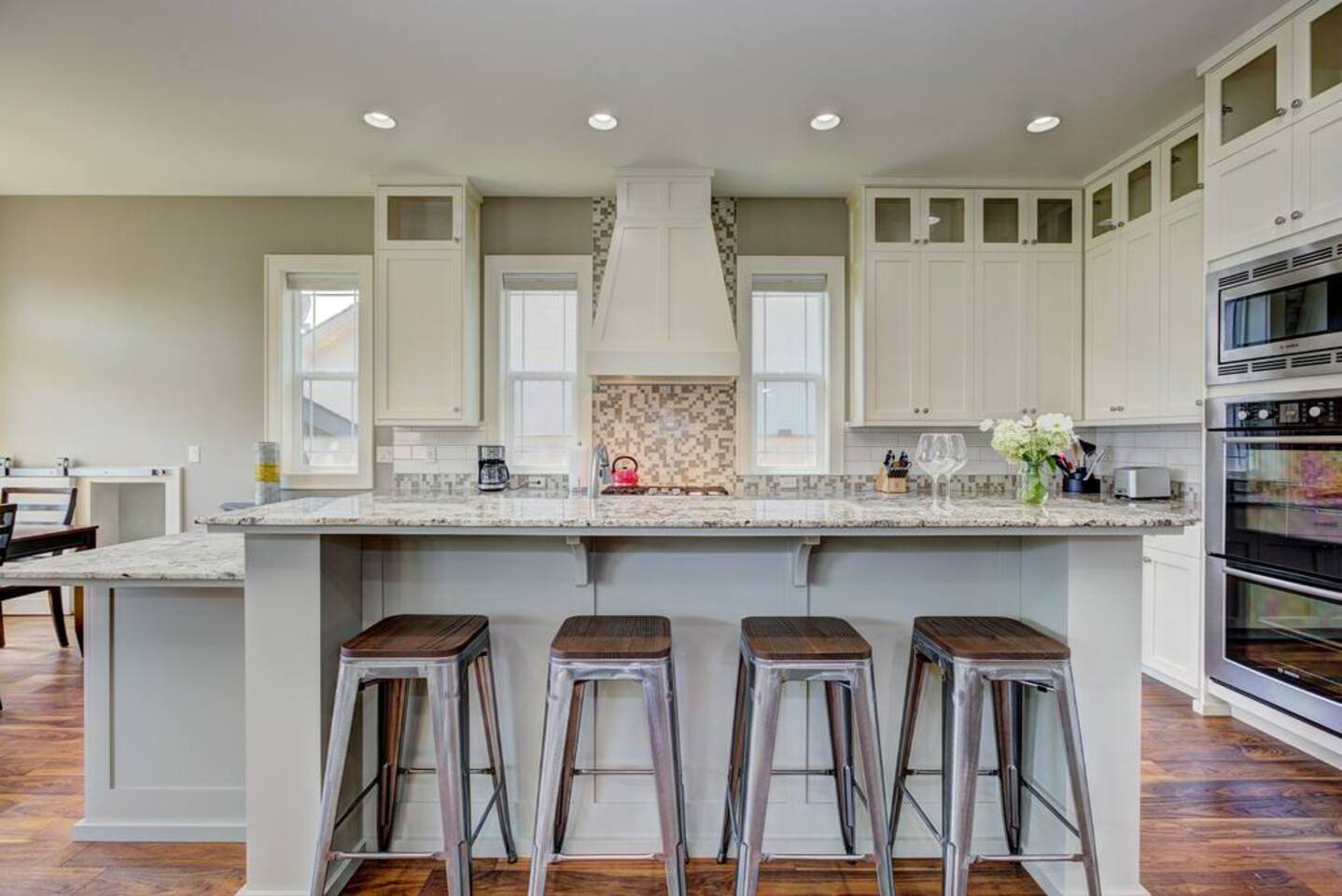 The dining room table can seat 6 comfortably. If you need a bigger table for all 10 guests to sit at one place, we can provide one at current rental rates. We can accommodate this with reasonable lead time and advance notice. Community pool is open during the summer months only. Installed microwave is tricky to use, so we've provided another microwave (on the counter).