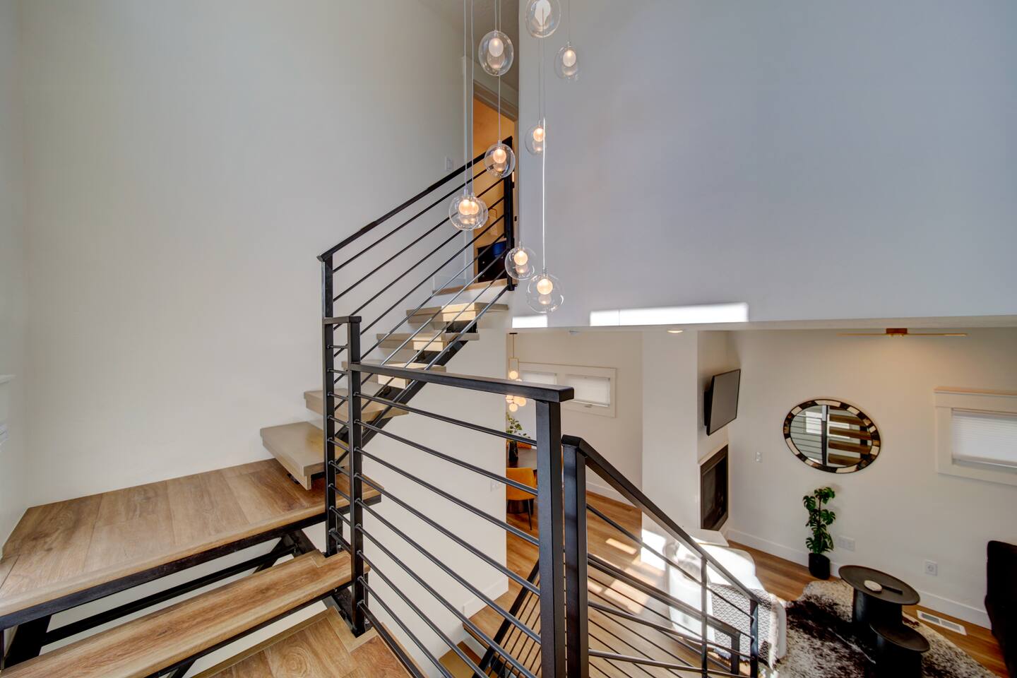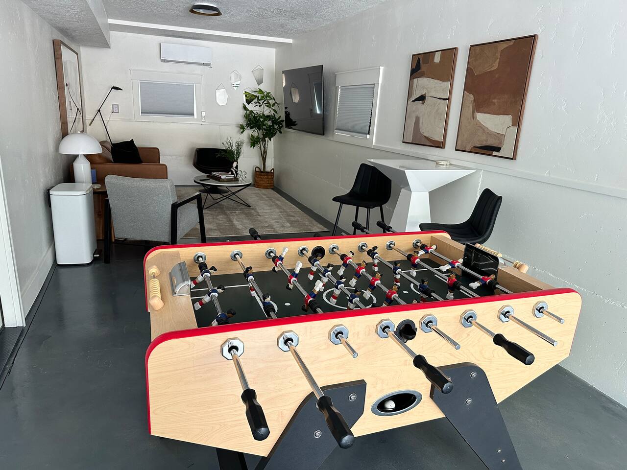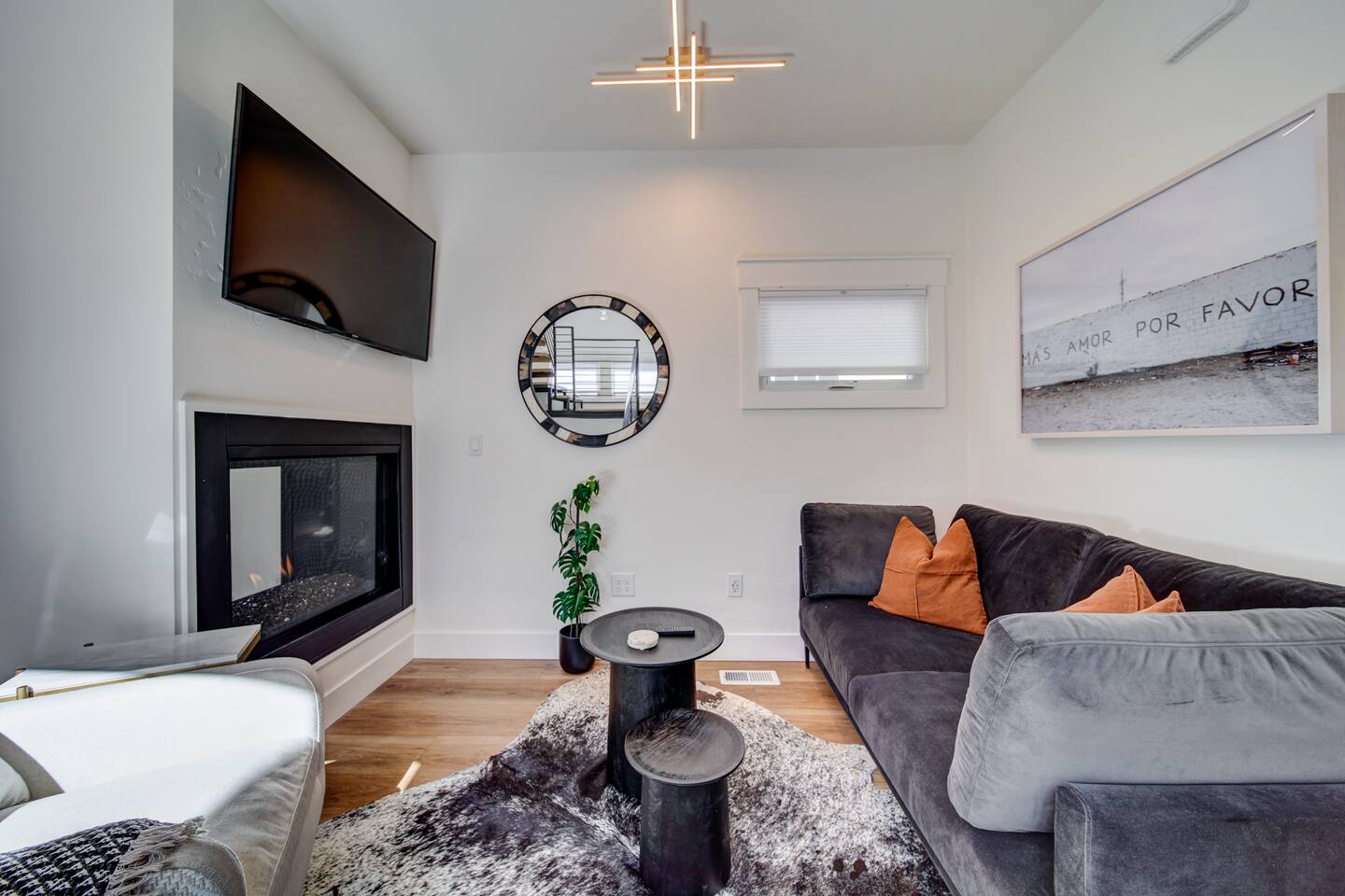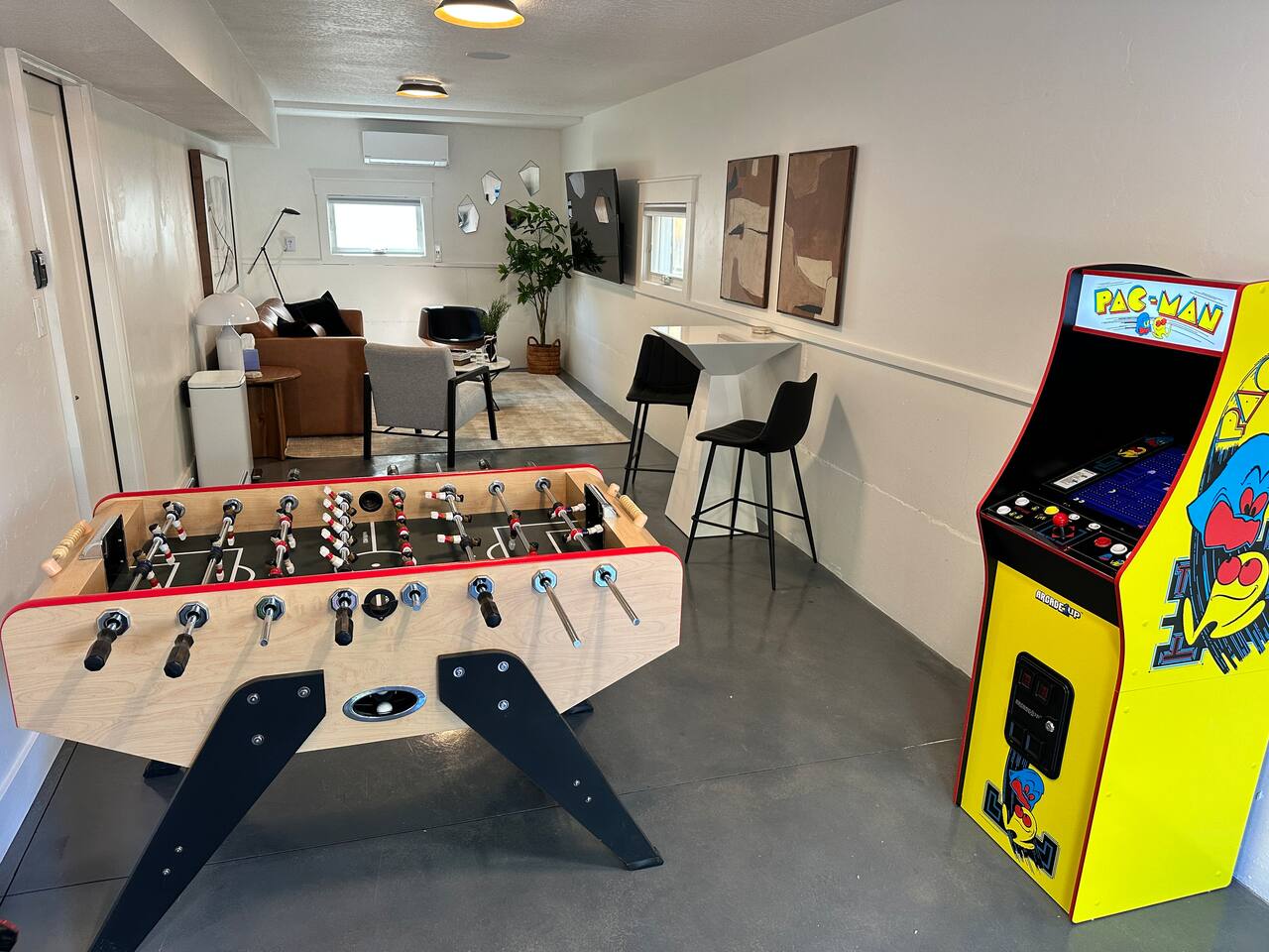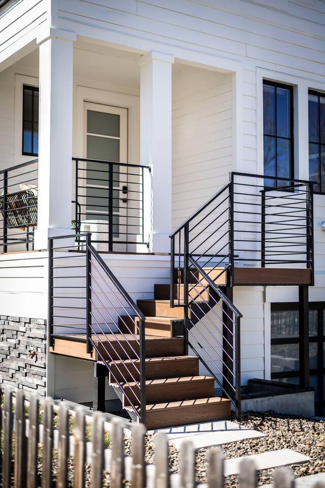 You are staying in a freestanding 1800 square foot newly built home with modern amenities including washer and dryer and gas fireplace. There is a full complement of cooking supplies, coffeemaker, ice maker and luxury appliances to prepare meals. The blue accents in the decor offset the caramel hues in the wood to make a playful and fun space. The garage has been outfitted for the perfect space to play games, watch a movie, and have a good nights sleep on the pull out couch. You’ll find a spacious porch with a patio couch to enjoy the weather, overlooking a picket fence. MAIN LEVEL Kitchen Half-Bath Office/Den w/Sofa Sleeper (Full) Living Room w/Fireplace Dining Kitchen Balcon Patio UPPER LEVEL Main Bedroom Suite King Bed Large Walk-In Closet Ensuite Bathroom LOWER LEVEL Second Bedroom Queen Bed Full Bath Laundry GARAGE/GAME ROOM Sofa Sleeper (Full) TV Games (Coming soon!) BED LOCATION/SIZES King Bed, Upper Level, Main bedroom Ensuite Queen Bed, Lower Level, Second bedroom Sofa Sleeper, Main Level, Office Sofa Sleeper, Lower Level, Garage/Game Room