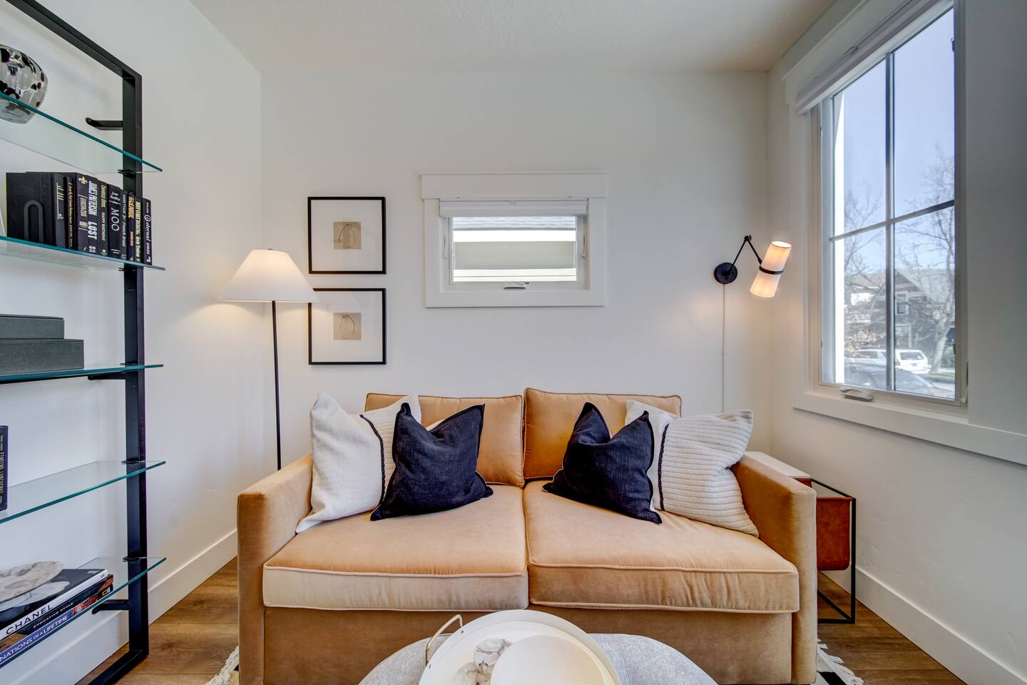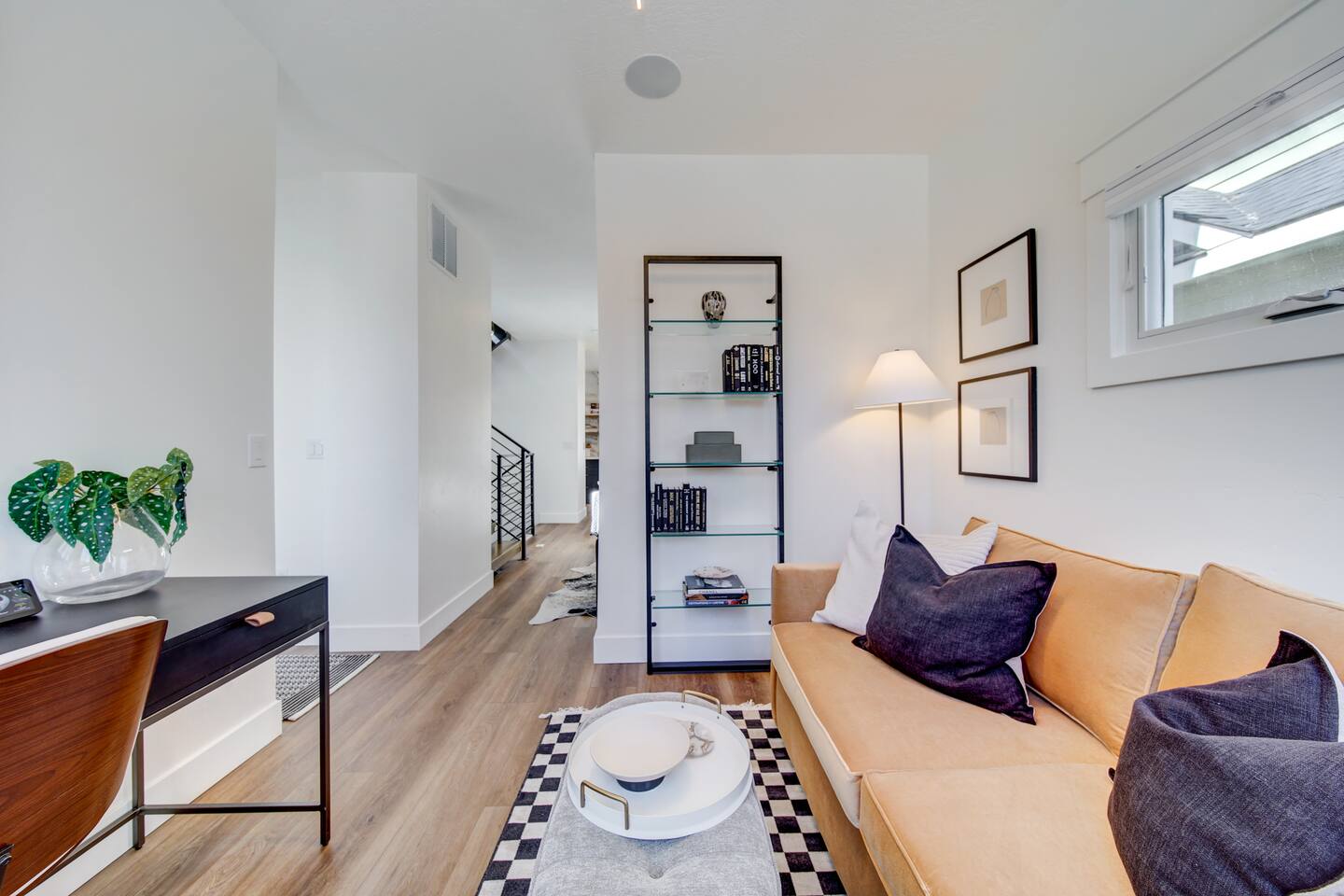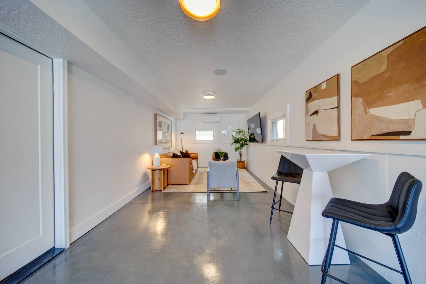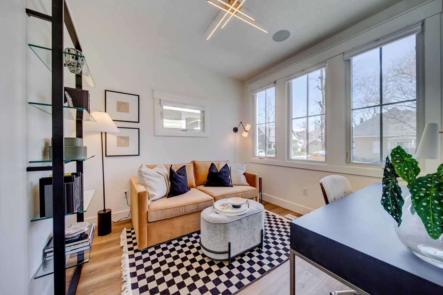 You are staying in a freestanding 1800 square foot newly built home with modern amenities including washer and dryer and gas fireplace. There is a full complement of cooking supplies, coffeemaker, ice maker and luxury appliances to prepare meals. The blue accents in the decor offset the caramel hues in the wood to make a playful and fun space. The garage has been outfitted for the perfect space to play games, watch a movie, and have a good nights sleep on the pull out couch. You’ll find a spacious porch with a patio couch to enjoy the weather, overlooking a picket fence. MAIN LEVEL Kitchen Half-Bath Office/Den w/Sofa Sleeper (Full) Living Room w/Fireplace Dining Kitchen Balcon Patio UPPER LEVEL Main Bedroom Suite King Bed Large Walk-In Closet Ensuite Bathroom LOWER LEVEL Second Bedroom Queen Bed Full Bath Laundry GARAGE/GAME ROOM Sofa Sleeper (Full) TV Games (Coming soon!) BED LOCATION/SIZES King Bed, Upper Level, Main bedroom Ensuite Queen Bed, Lower Level, Second bedroom Sofa Sleeper, Main Level, Office Sofa Sleeper, Lower Level, Garage/Game Room