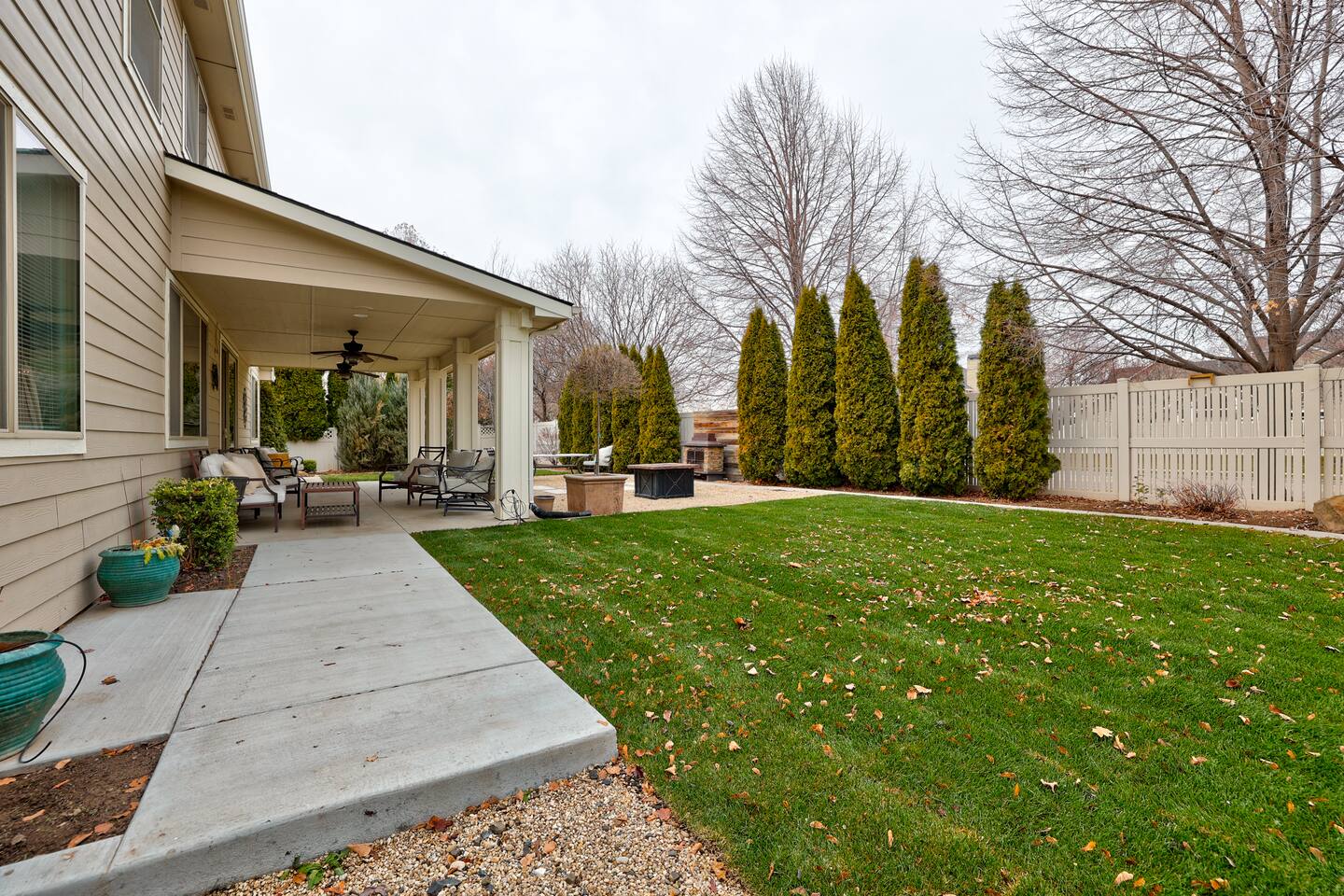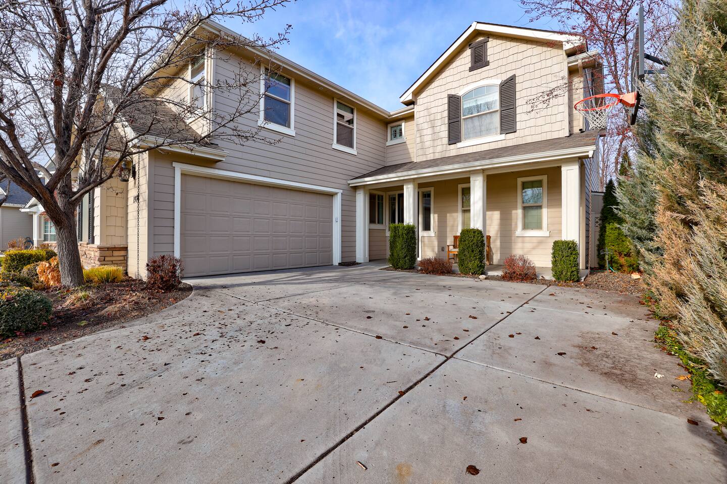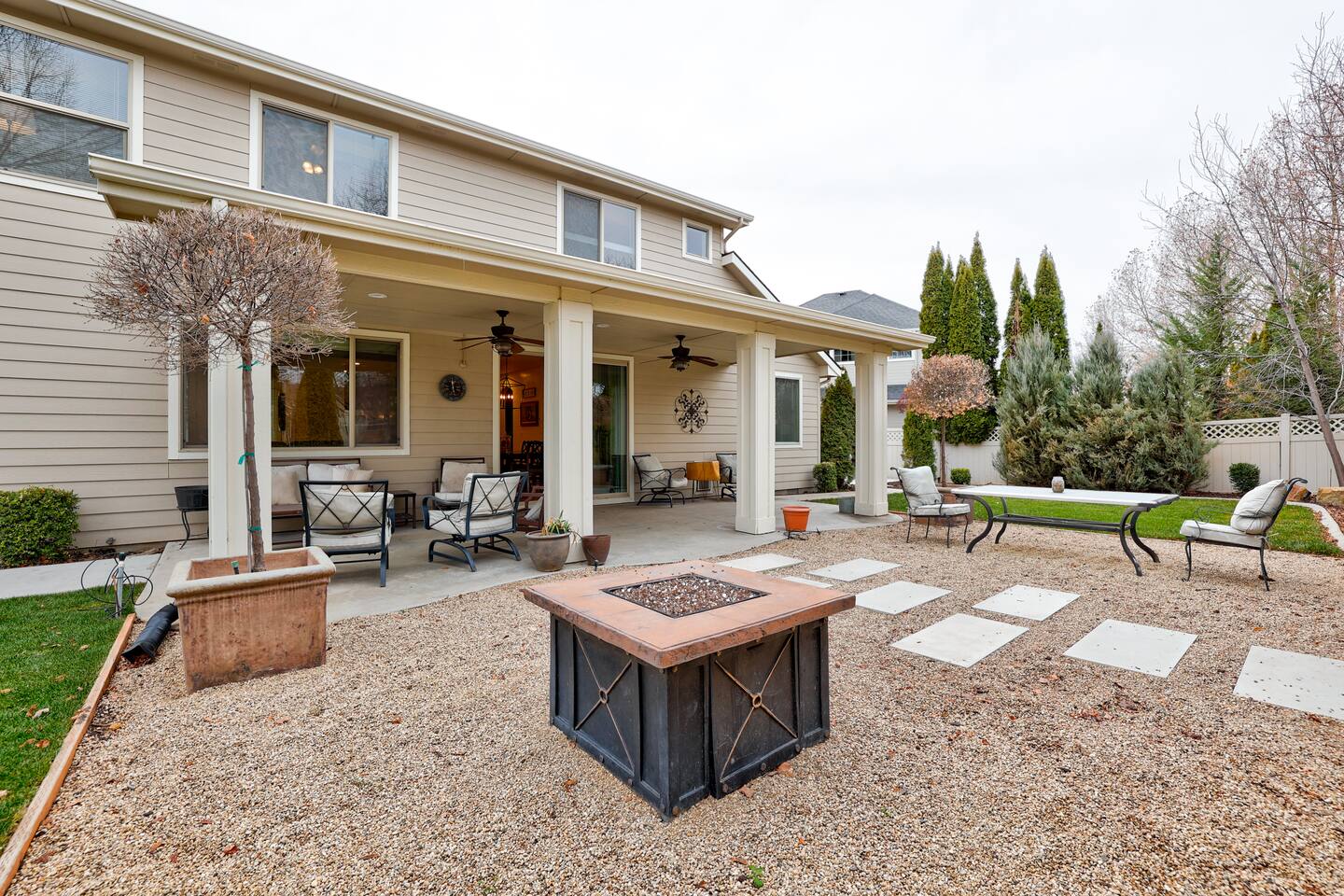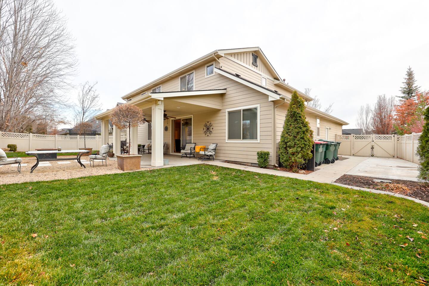 ---Welcome--- We’d be happy to host you at this spacious Meridian home with 2,991 square feet! Perfect for families or groups, this home offers everything you need for a comfortable and memorable stay. ---Living Room--- Cozy seating for your group Smart TV with local channels and streaming apps Open layout connecting to the dining area ---Family Room--- Games and activities for all ages Smart TV for extra entertainment Spacious area perfect for relaxing or movie nights ---Kitchen--- Fully stocked and a chef’s dream! Modern appliances, including a dishwasher and coffee maker Ample counter space for meal preparation ---Bedrooms--- Master suite: king bed, soaker tub, and separate shower Upstairs: one queen bedroom and one double bedroom Main floor: queen bedroom for added convenience ---Outdoor Space--- Large fenced backyard with an outdoor dining area Wood-burning fireplace for cozy evenings Fire pit for group gatherings ---Additional Amenities--- Indoor gym for staying active Washer/dryer for guest use Off-street parking for 5 vehicles ---Community Amenities--- Seasonal community pool (Memorial Day–Labor Day), a short walk from the house Community center available for events (seats 40 with six tables; $150 rental fee per day, subject to HOA calendar availability) ---Pet Policy--- We welcome up to 2 dogs with special rules.