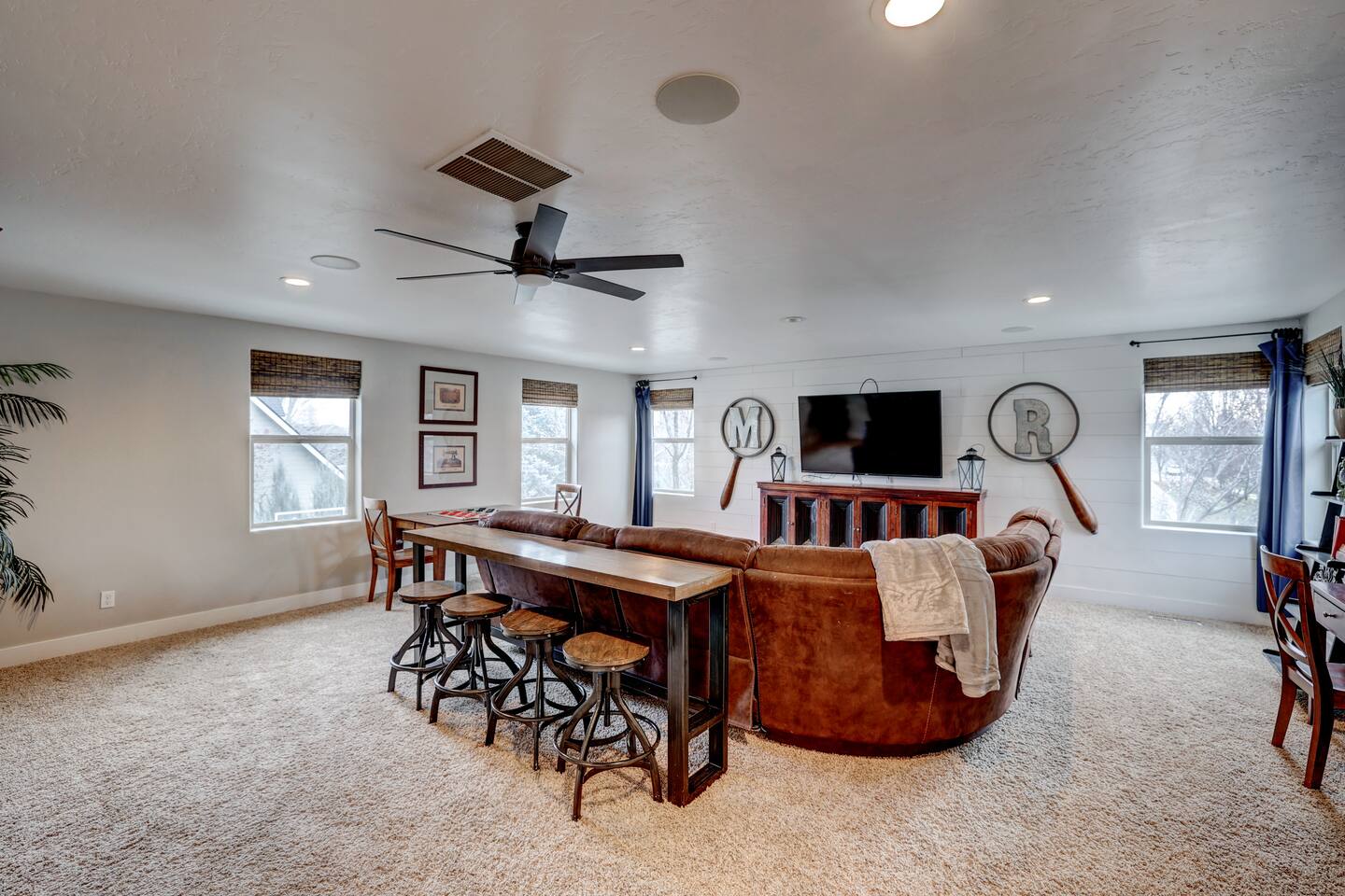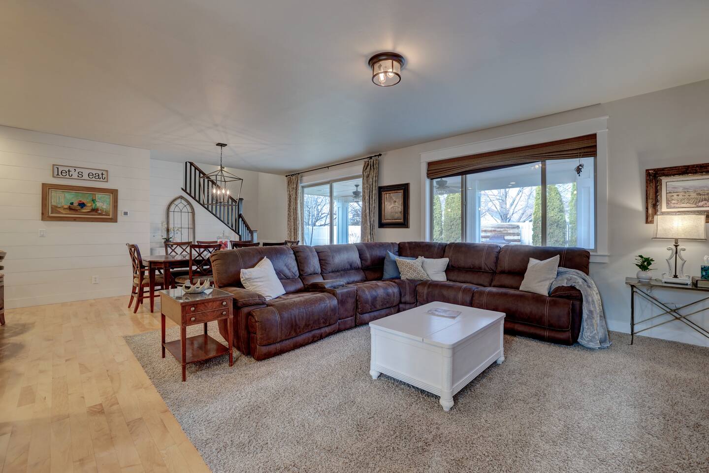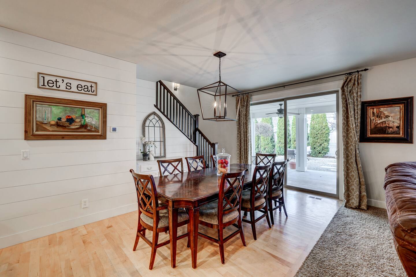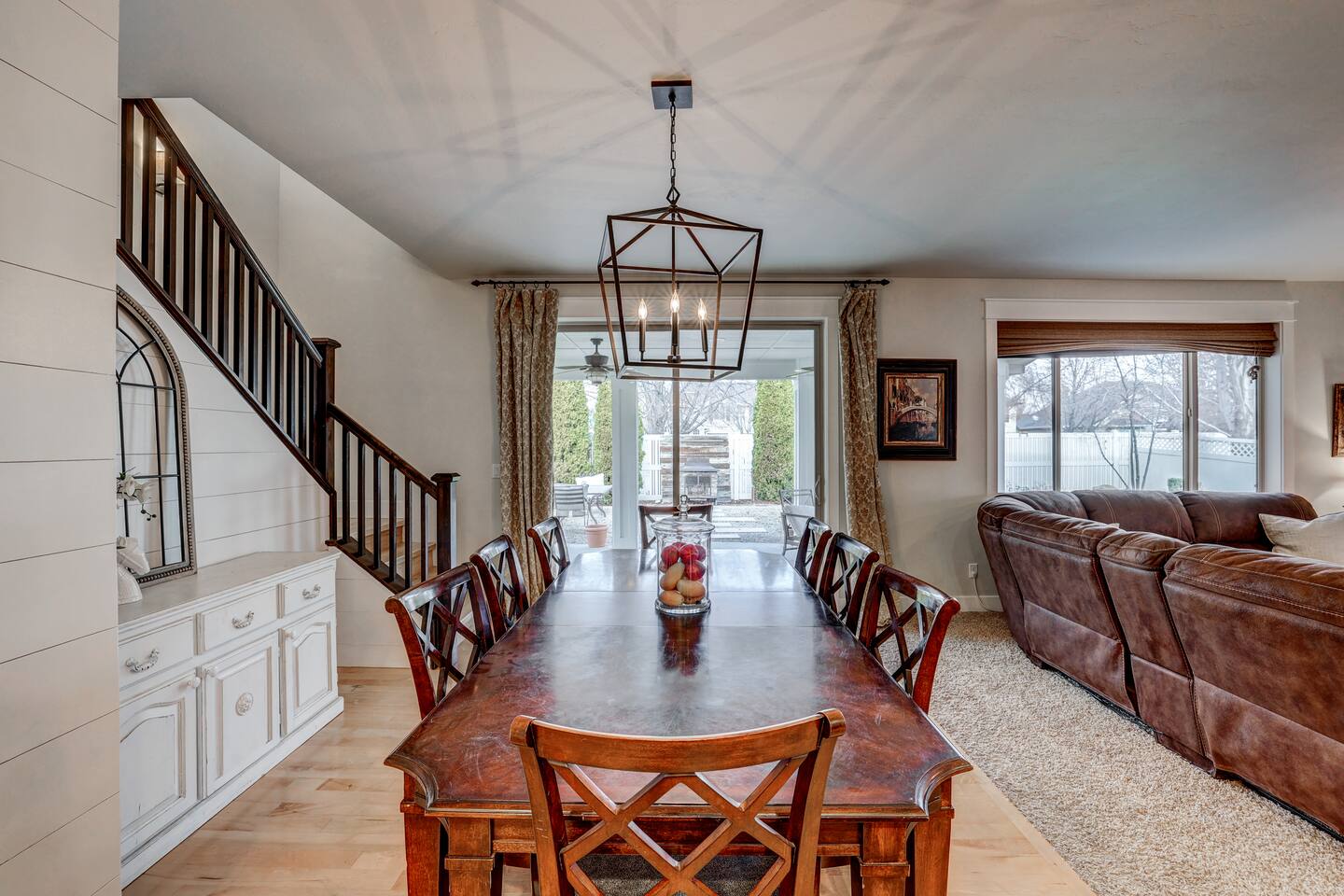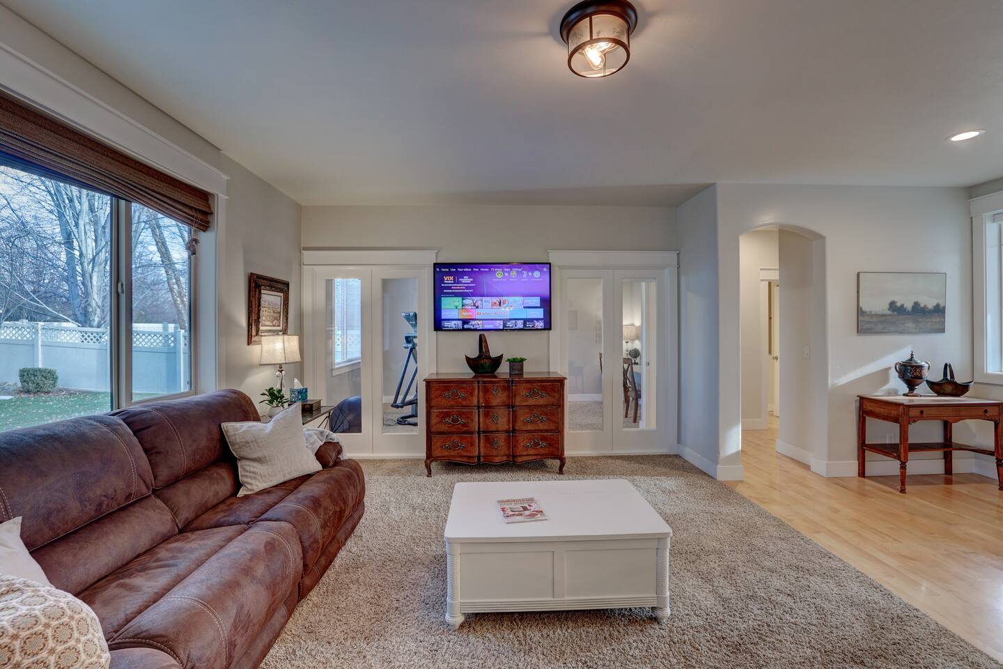 ---Welcome--- We’d be happy to host you at this spacious Meridian home with 2,991 square feet! Perfect for families or groups, this home offers everything you need for a comfortable and memorable stay. ---Living Room--- Cozy seating for your group Smart TV with local channels and streaming apps Open layout connecting to the dining area ---Family Room--- Games and activities for all ages Smart TV for extra entertainment Spacious area perfect for relaxing or movie nights ---Kitchen--- Fully stocked and a chef’s dream! Modern appliances, including a dishwasher and coffee maker Ample counter space for meal preparation ---Bedrooms--- Master suite: king bed, soaker tub, and separate shower Upstairs: one queen bedroom and one double bedroom Main floor: queen bedroom for added convenience ---Outdoor Space--- Large fenced backyard with an outdoor dining area Wood-burning fireplace for cozy evenings Fire pit for group gatherings ---Additional Amenities--- Indoor gym for staying active Washer/dryer for guest use Off-street parking for 5 vehicles ---Community Amenities--- Seasonal community pool (Memorial Day–Labor Day), a short walk from the house Community center available for events (seats 40 with six tables; $150 rental fee per day, subject to HOA calendar availability) ---Pet Policy--- We welcome up to 2 dogs with special rules.