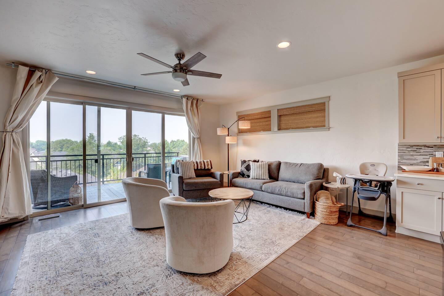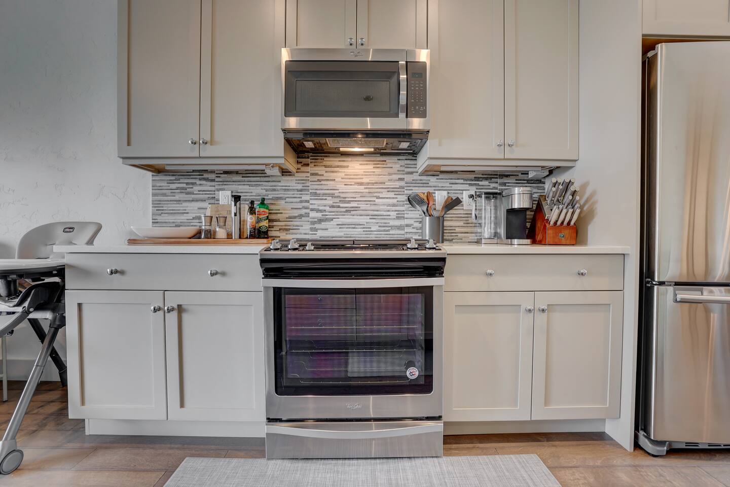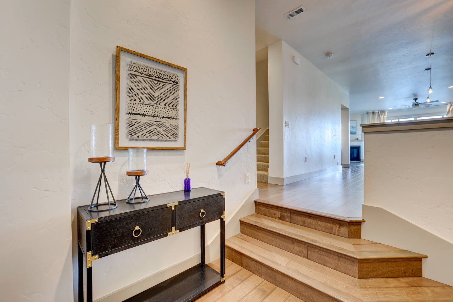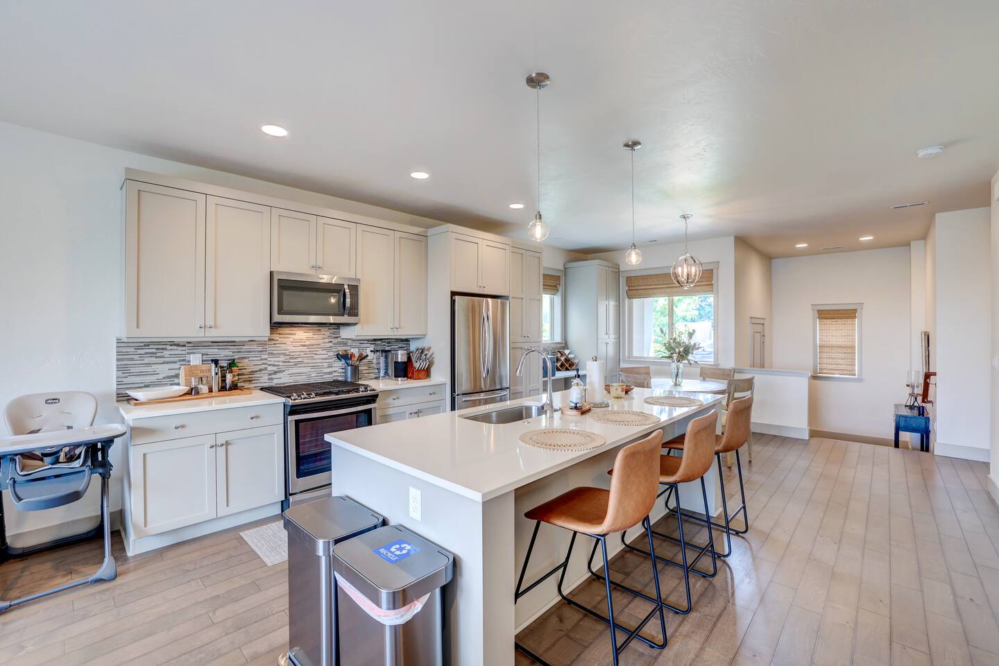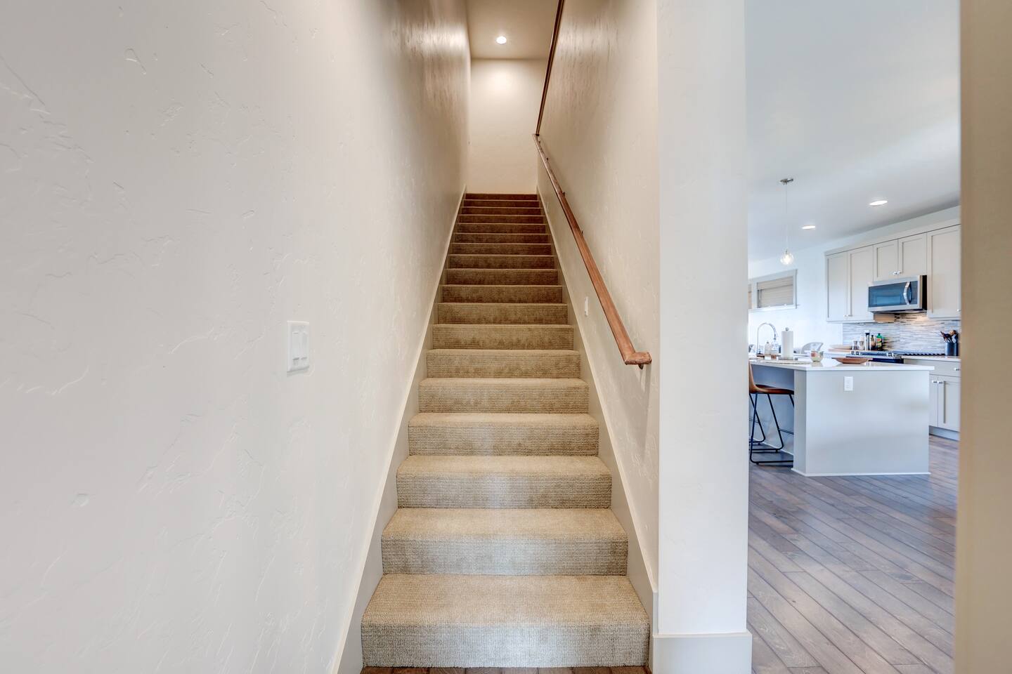 The property is a Two Story Home with a below-grade (basement) bonus room and garage. BELOW GRADE/BASEMENT -Garage Access: When you arrive, you'll be accessing the home through the garage on the back side of the townhome, specific instructions will be shared approximately three days before your check-in day and time. You'll have room in the garage for up to two fairly large vehicles. The owner has regularly parked a large Ford Truck and large SUV in the garage together. There are also a couple of spaces at the entrance of the parking lot first come first served. -Bonus Room: Upon entering the home through the garage, you'll be in the bonus room. The bonus room has a large comfortable sectional couch and a big-screen smartTV. That tv does not have a local tv channel antenna. MAIN LEVEL The main level consists of the front entryway, a dining area, a fully stocked kitchen, a living room, a powder bathroom, and a large balcony/patio. It is an open concept/great room design and is the home's heartbeat. -Kitchen: The kitchen is fully equipped for food prep, cooking, baking, and eating needs. There is enough dining ware for 6. There is a Keurig as well as a drip coffee maker. We provide some coffee, but if you're a big coffee fan, you may want to supplement. -Dining Area: The dining table accommodates 4, however, the adjacent breakfast bar can accommodate 3 additional. We also have a high chair for any kiddos that need it. -Great Room/Living Room: The living room has a large Smart TV, but also does not have an HD antenna for accessing local channels. You're welcome to log into your favorite apps, we do not provide login details for guests. There's a gas fireplace that is great for seasonal comfort. -Patio/Balcony: The patio balcony is a great place to relax, and catch a sunrise or sunset. UPSTAIRS The upstairs area is home to 3-bedrooms, 2-bathrooms (one of which is ensuite), and laundry room. Main Bedroom: King Bed, ensuite, walk-in closet, upper patio access. Bedroom Two: Queen Bed, closet. Bedroom Three: Queen Bed, closet. Laundry: Washer, Dryer, small sink. Bathroom Two: Toilet, Shower/Tub ***STAIRS*** There is no way to access the home without climbing some stairs. From the front entryway, expect to climb no more than 7 stairs. From the garage entrance, expect to climb at least 15 stairs From the main level to the bedrooms, expect to climb at least 15 stairs.