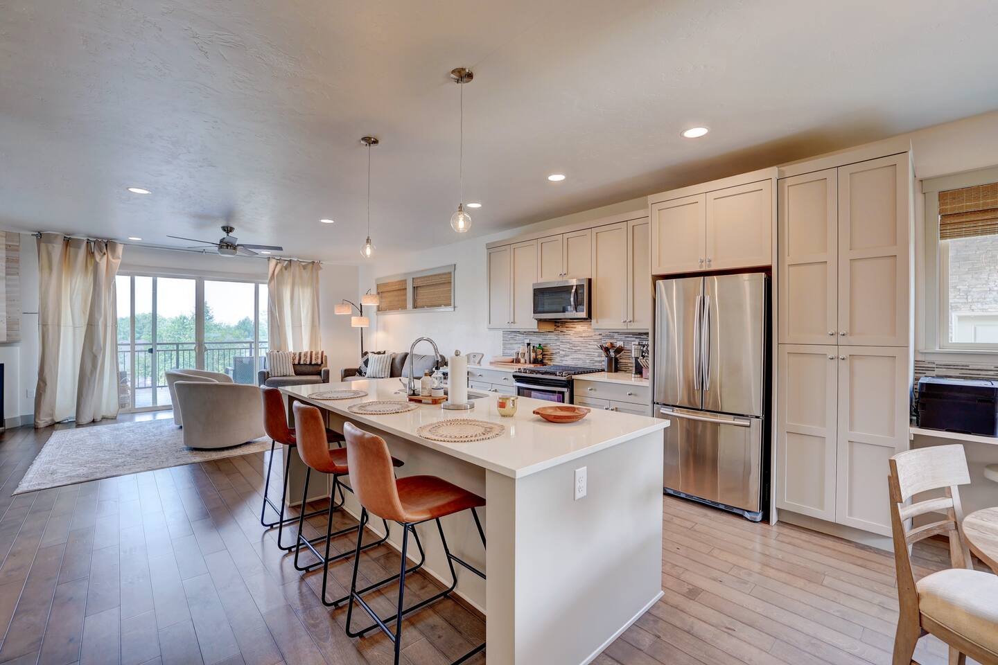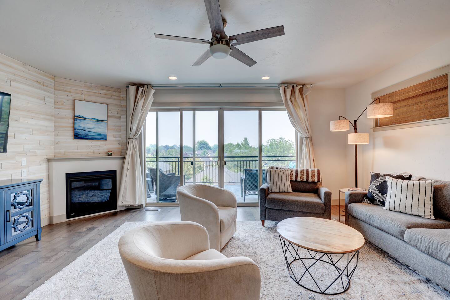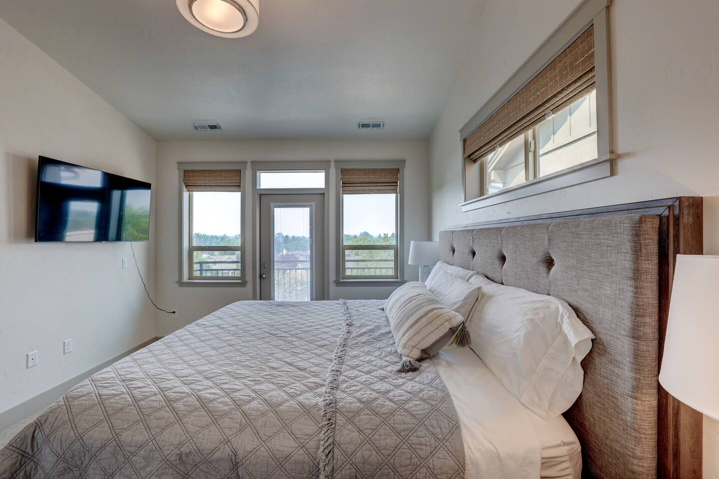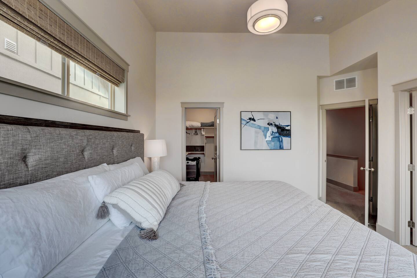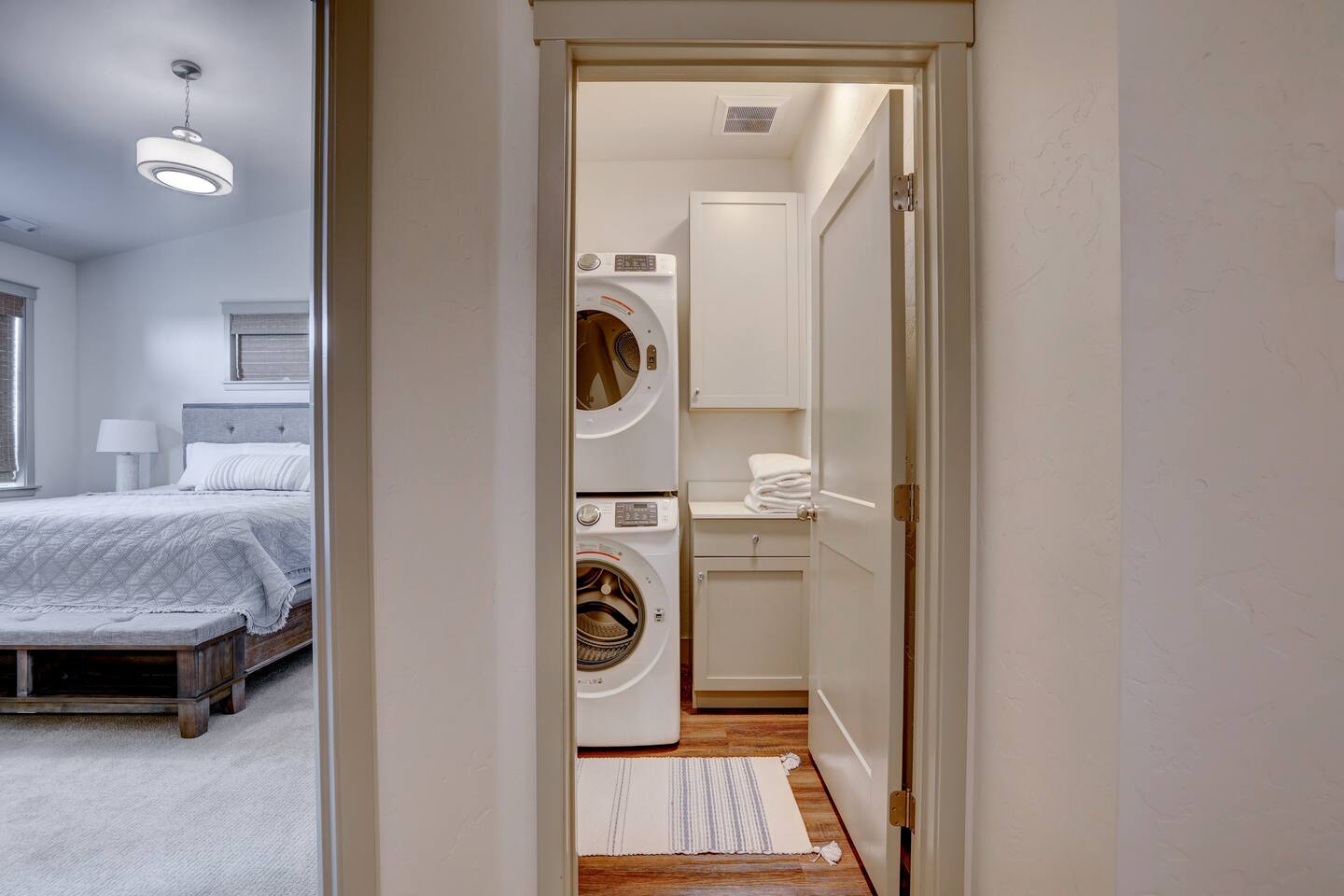 The property is a Two Story Home with a below-grade (basement) bonus room and garage. BELOW GRADE/BASEMENT -Garage Access: When you arrive, you'll be accessing the home through the garage on the back side of the townhome, specific instructions will be shared approximately three days before your check-in day and time. You'll have room in the garage for up to two fairly large vehicles. The owner has regularly parked a large Ford Truck and large SUV in the garage together. There are also a couple of spaces at the entrance of the parking lot first come first served. -Bonus Room: Upon entering the home through the garage, you'll be in the bonus room. The bonus room has a large comfortable sectional couch and a big-screen smartTV. That tv does not have a local tv channel antenna. MAIN LEVEL The main level consists of the front entryway, a dining area, a fully stocked kitchen, a living room, a powder bathroom, and a large balcony/patio. It is an open concept/great room design and is the home's heartbeat. -Kitchen: The kitchen is fully equipped for food prep, cooking, baking, and eating needs. There is enough dining ware for 6. There is a Keurig as well as a drip coffee maker. We provide some coffee, but if you're a big coffee fan, you may want to supplement. -Dining Area: The dining table accommodates 4, however, the adjacent breakfast bar can accommodate 3 additional. We also have a high chair for any kiddos that need it. -Great Room/Living Room: The living room has a large Smart TV, but also does not have an HD antenna for accessing local channels. You're welcome to log into your favorite apps, we do not provide login details for guests. There's a gas fireplace that is great for seasonal comfort. -Patio/Balcony: The patio balcony is a great place to relax, and catch a sunrise or sunset. UPSTAIRS The upstairs area is home to 3-bedrooms, 2-bathrooms (one of which is ensuite), and laundry room. Main Bedroom: King Bed, ensuite, walk-in closet, upper patio access. Bedroom Two: Queen Bed, closet. Bedroom Three: Queen Bed, closet. Laundry: Washer, Dryer, small sink. Bathroom Two: Toilet, Shower/Tub ***STAIRS*** There is no way to access the home without climbing some stairs. From the front entryway, expect to climb no more than 7 stairs. From the garage entrance, expect to climb at least 15 stairs From the main level to the bedrooms, expect to climb at least 15 stairs.