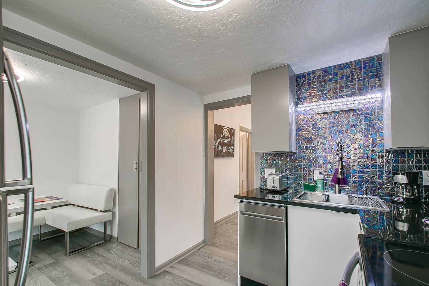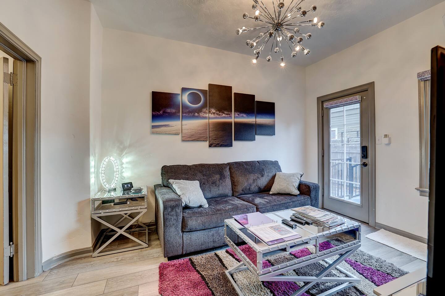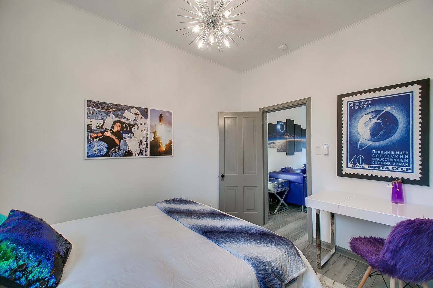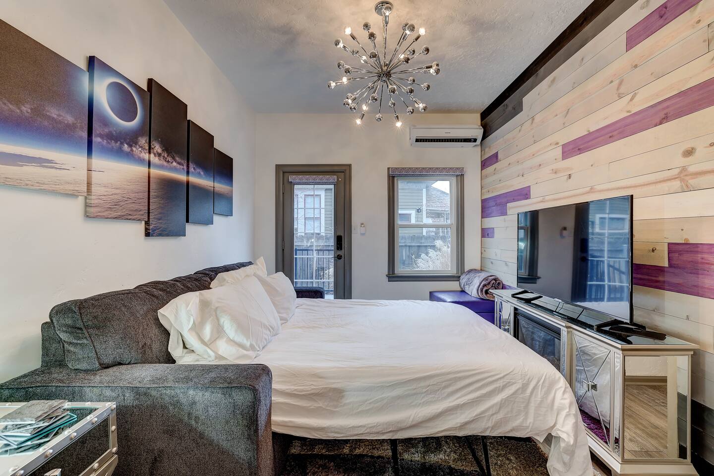 This is the downstairs back unit of a 107 year old triplex. The decor is intended to teleport our guests back to 1957 and the space race, where the Soviet Union and the United States competed to launch rockets into the atmosphere. The purple colorings make you feel like you're in the cosmos, and the mirrored furnishings and rivets harken back to days gone by where ANYTHING WAS POSSIBLE. Please also note that we have brand new AC/heating units that keep you comfortable no matter what the season. They can blow hot or cold as needed but you are in control of the temperature and each apartment has dedicated units so you are not sharing air with other guests. Approx. 650 square feet of living space.