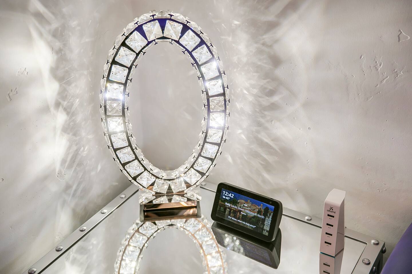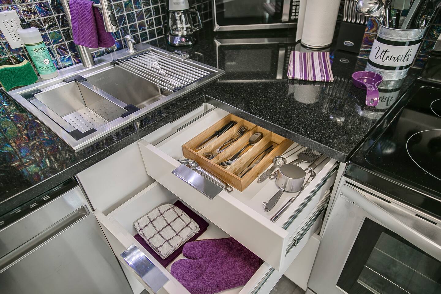 We have designed this luxury unit from the ground up to thrill and intrigue the senses of our guests. Bedazzled in chrome and rivets, this unit blends style, technology and comfort. From the purple accents to the lighting to the amenities, we tried to think of every comfort our guests could imagine and then some.