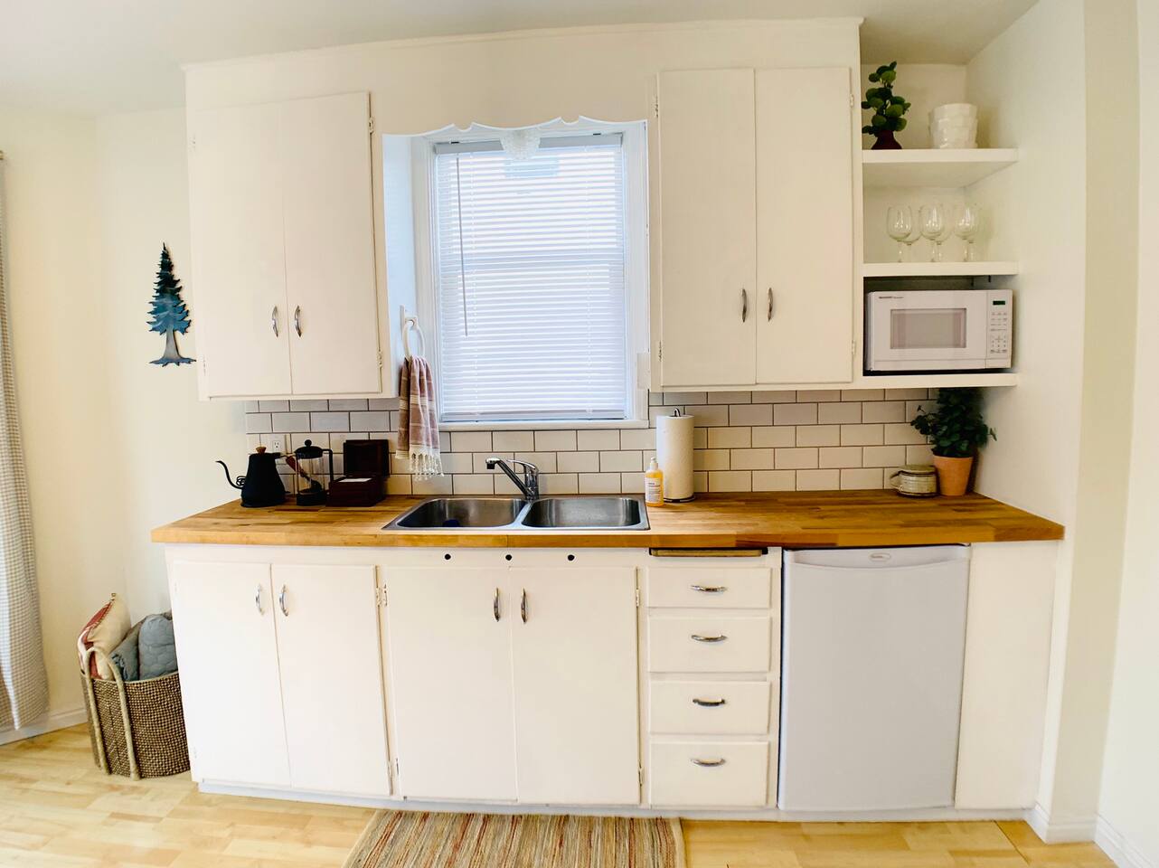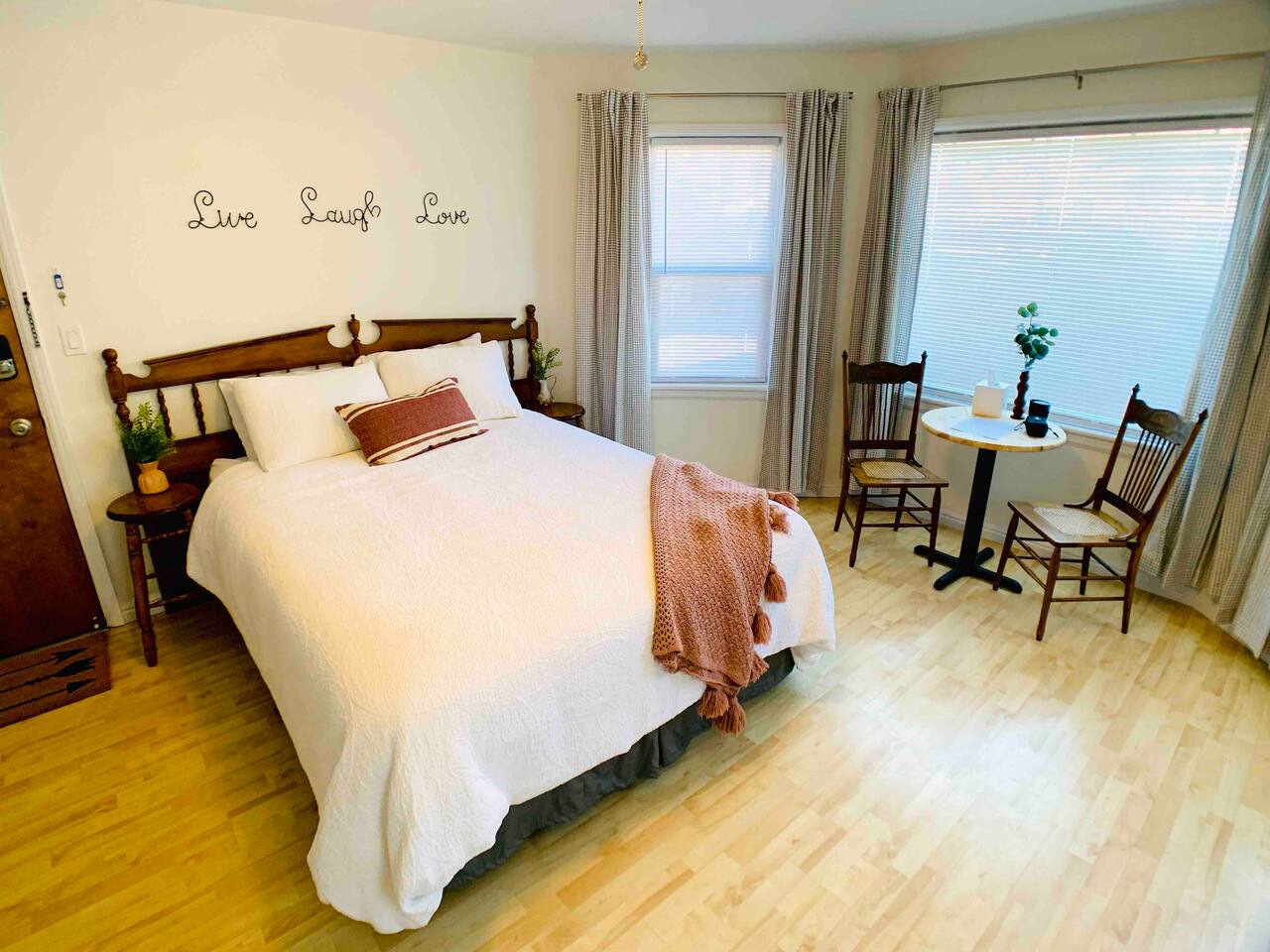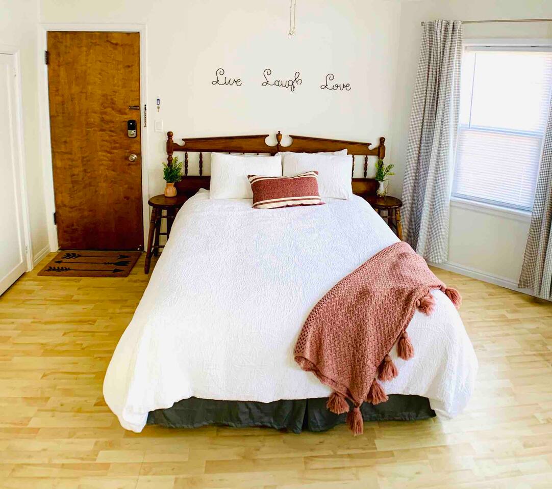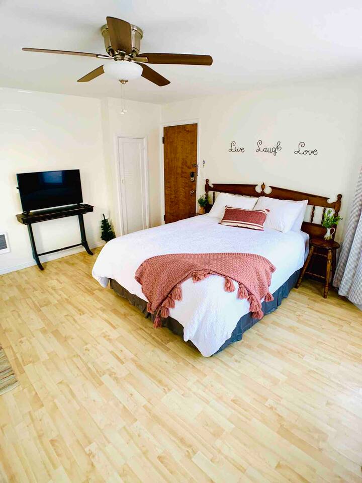 This apartment is part of a 100-year-old Boise home that got turned into a five-plex somewhere in its past life. It’s not trying to be fancy — it’s clean, comfy, and perfect if you care more about location and value than marble countertops. This is a cozy no-frills studio with everything you need in a compact setup. SLEEPING & LIVING -Queen bed -Small table for eating or working -TV for downtime -Kitchenette -Mini fridge -Microwave -Coffee maker -Basic dishes (no stove or cooktop) -Bathroom -Private, locked bathroom just a few steps down the shared hallway THE BUILDING -100-year-old home turned 5-plex with charm and quirks -Prime location means a bit of city/traffic noise -Earplugs provided for light sleepers THE REAL TALK -Clean, simple, and here to save your budget. -It’s an older building with quirks and some traffic noise. -We stock earplugs by the bed for light sleepers -Parking can be tricky, but hit "Other details to note" for more on that. Most guest park just fine. -If you want sleek and high-end, this isn’t that. But if you're after location, walkability, and a place that quietly saves the day without breaking the bank — you’re in the right spot.