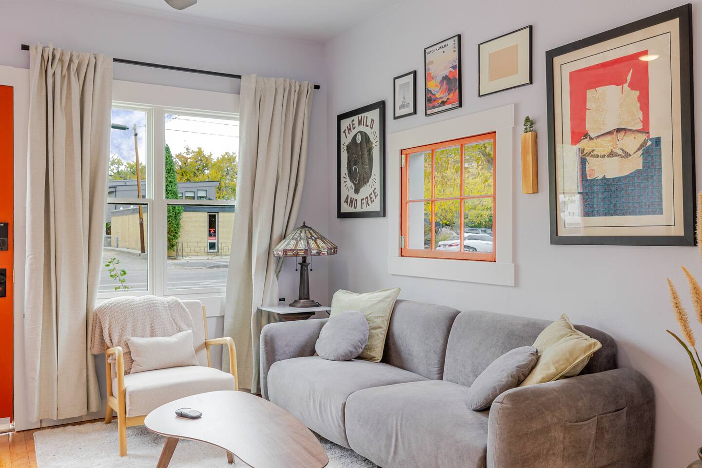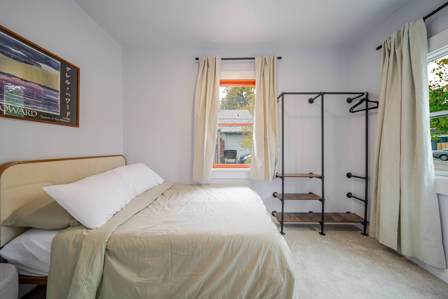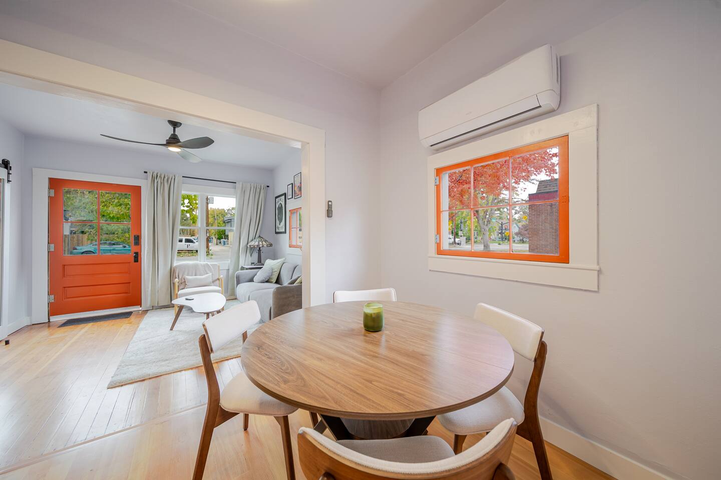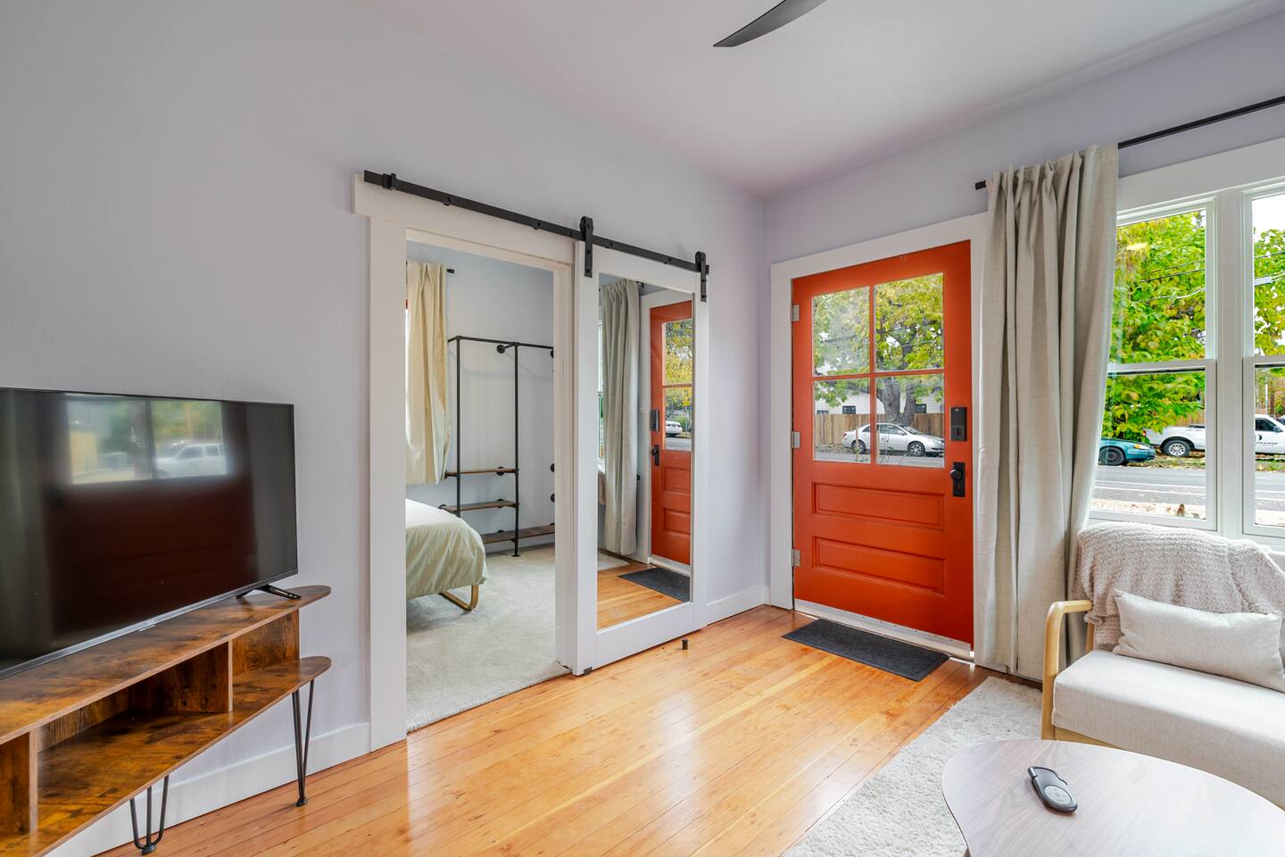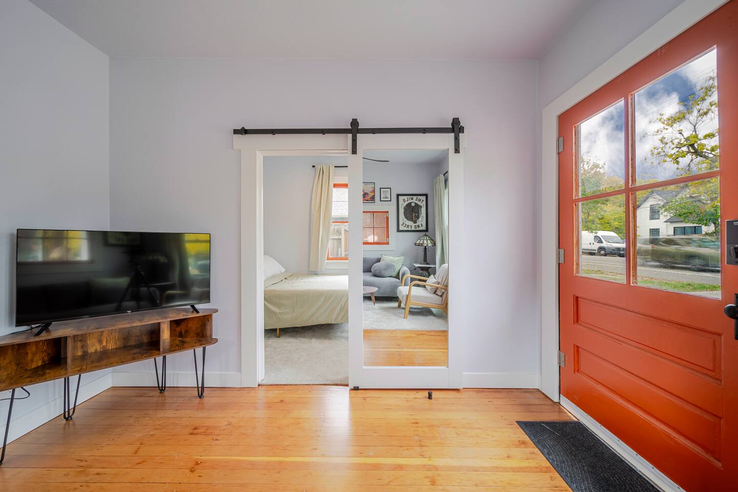 Property Description Welcome to this cheerful North End cottage—bright, comfortable, and thoughtfully arranged for a simple, relaxing Boise stay. The home blends vintage charm with modern convenience, offering all the essentials in a walkable, tree-lined neighborhood close to Hyde Park and downtown. Exterior: Private off-street parking for one vehicle is available beside the home. Additional vehicles can use street parking nearby. Living Area: The main living space is cozy and full of natural light, featuring a comfortable couch, accent chair, and smart TV for streaming your favorite shows after a day of exploring Boise. -Dining Area: A dedicated dining nook seats four comfortably—perfect for meals, games, or getting some work done. -Kitchen: A fully stocked galley kitchen with generous counter space, cookware, utensils, and small appliances. Ideal for preparing everything from morning coffee (drip coffee maker) to full meals. -Bedroom 1: Includes a full-size bed behind a rustic barn-style sliding door, with a custom-built garment rack and shelf for storage. -Bedroom 2: Offers a queen bed, dresser, and garment rack, along with access to an in-unit stackable washer and dryer for convenience during longer stays. -Bathroom: Features a narrow but functional layout with a tub/shower combo, vanity, and toilet. Compact yet efficient, providing everything you need for a comfortable stay.