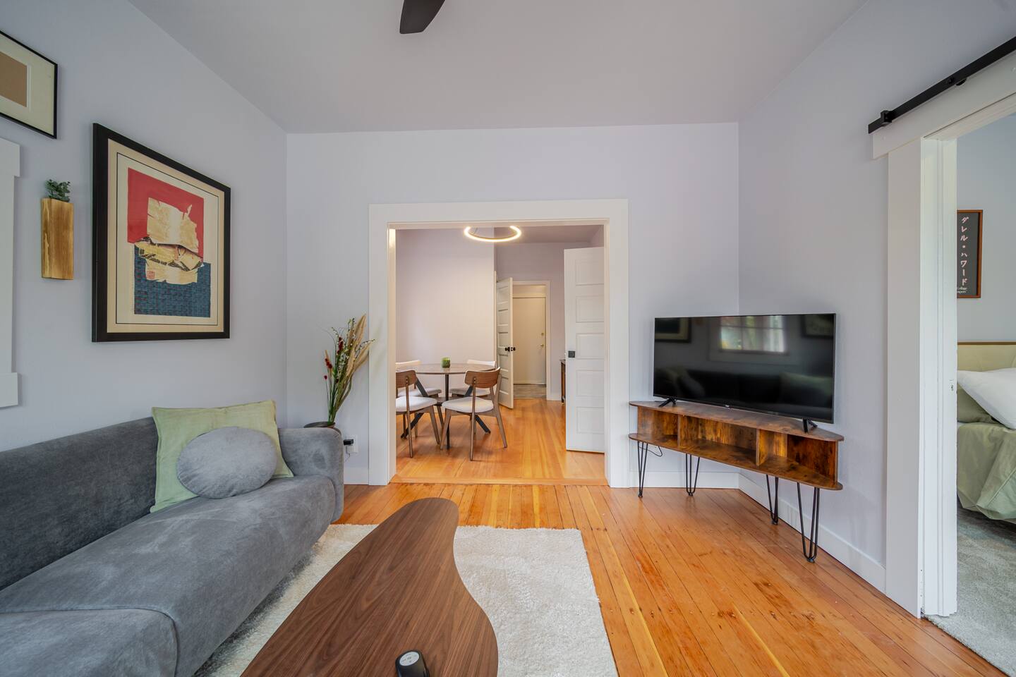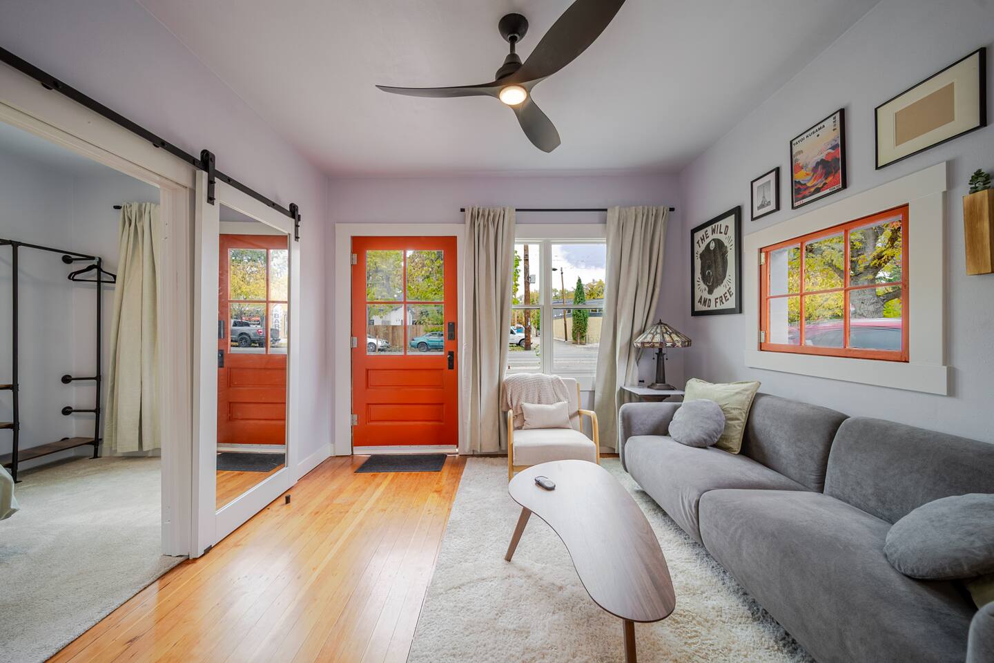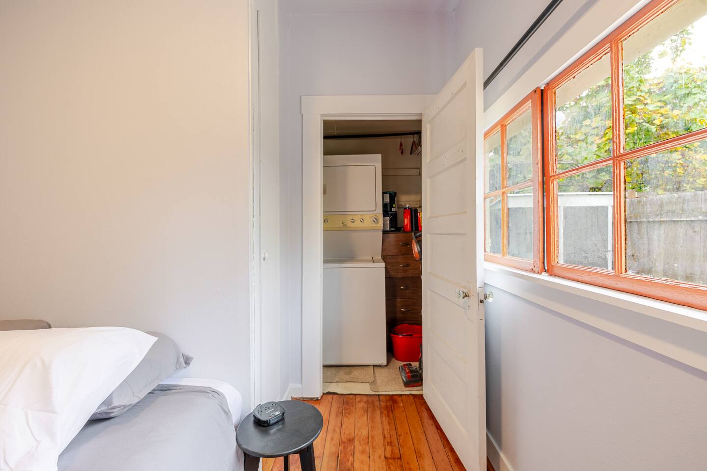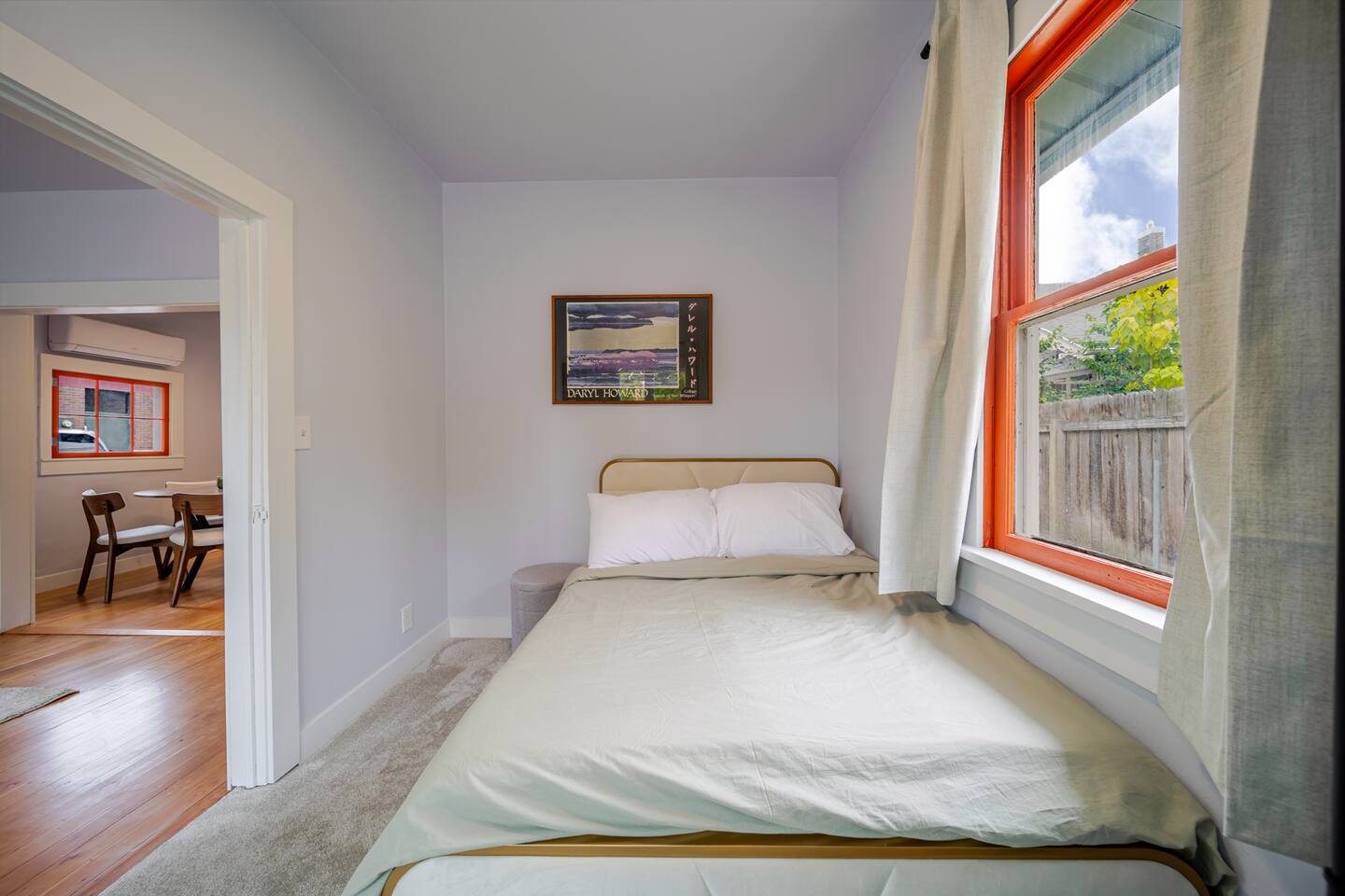 Property Description Welcome to this cheerful North End cottage—bright, comfortable, and thoughtfully arranged for a simple, relaxing Boise stay. The home blends vintage charm with modern convenience, offering all the essentials in a walkable, tree-lined neighborhood close to Hyde Park and downtown. Exterior: Private off-street parking for one vehicle is available beside the home. Additional vehicles can use street parking nearby. Living Area: The main living space is cozy and full of natural light, featuring a comfortable couch, accent chair, and smart TV for streaming your favorite shows after a day of exploring Boise. -Dining Area: A dedicated dining nook seats four comfortably—perfect for meals, games, or getting some work done. -Kitchen: A fully stocked galley kitchen with generous counter space, cookware, utensils, and small appliances. Ideal for preparing everything from morning coffee (drip coffee maker) to full meals. -Bedroom 1: Includes a full-size bed behind a rustic barn-style sliding door, with a custom-built garment rack and shelf for storage. -Bedroom 2: Offers a queen bed, dresser, and garment rack, along with access to an in-unit stackable washer and dryer for convenience during longer stays. -Bathroom: Features a narrow but functional layout with a tub/shower combo, vanity, and toilet. Compact yet efficient, providing everything you need for a comfortable stay.