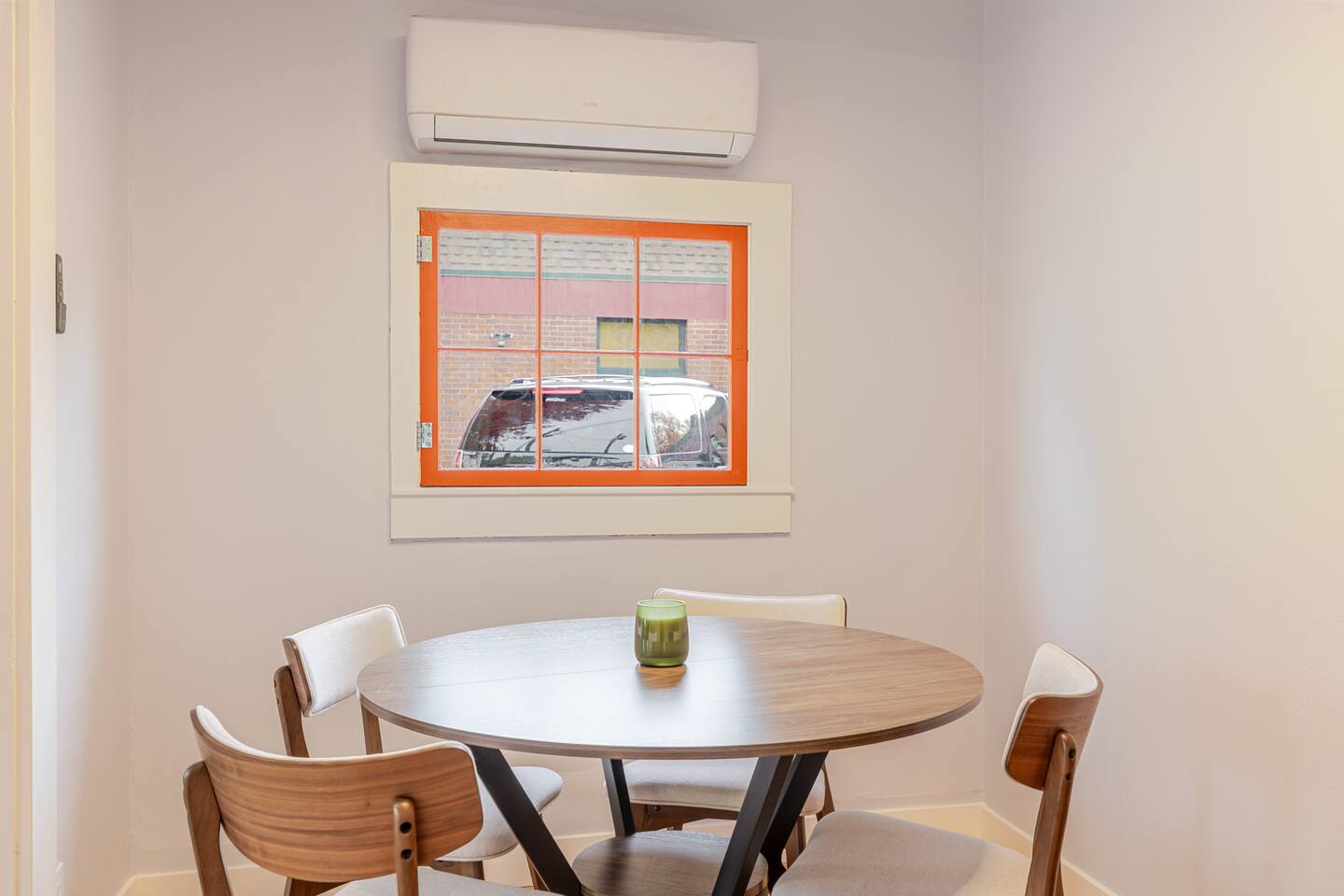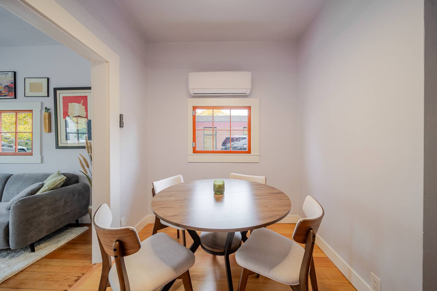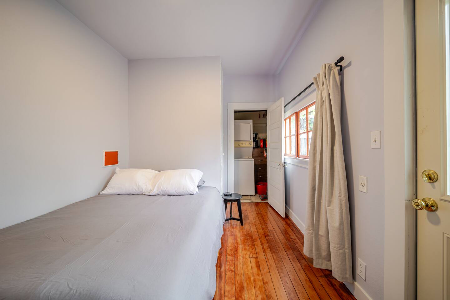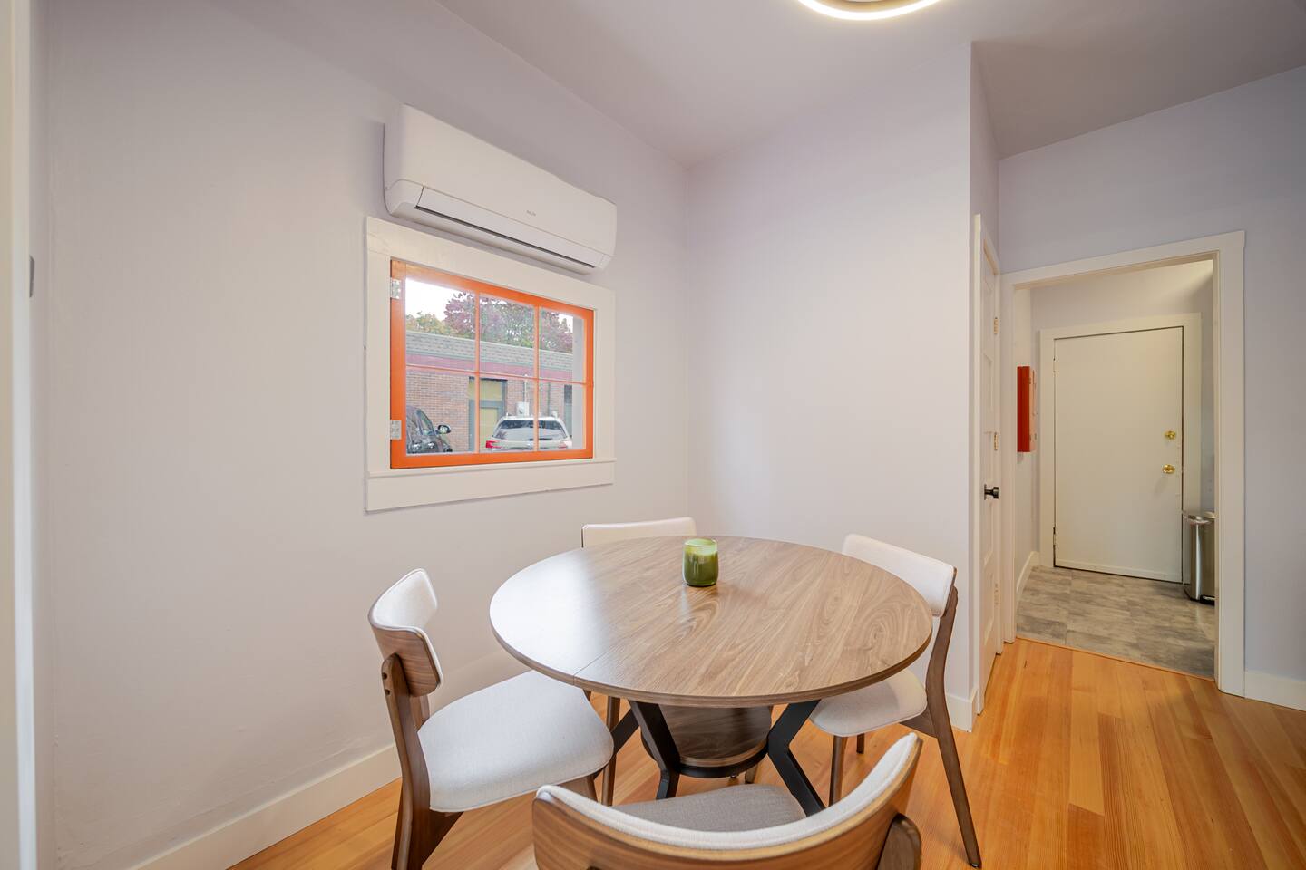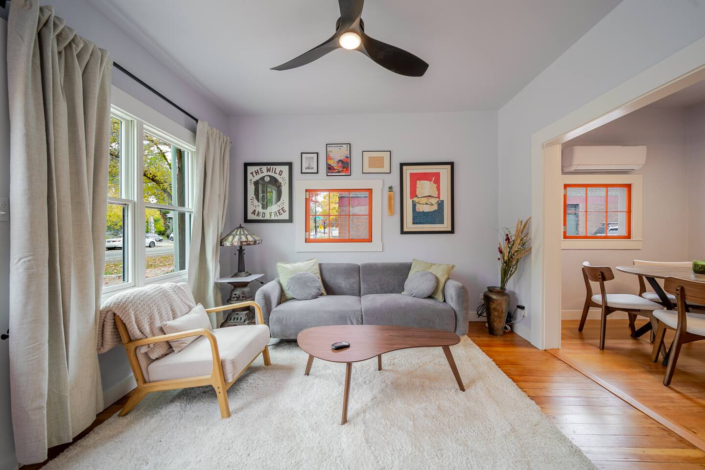 Property Description Welcome to this cheerful North End cottage—bright, comfortable, and thoughtfully arranged for a simple, relaxing Boise stay. The home blends vintage charm with modern convenience, offering all the essentials in a walkable, tree-lined neighborhood close to Hyde Park and downtown. Exterior: Private off-street parking for one vehicle is available beside the home. Additional vehicles can use street parking nearby. Living Area: The main living space is cozy and full of natural light, featuring a comfortable couch, accent chair, and smart TV for streaming your favorite shows after a day of exploring Boise. -Dining Area: A dedicated dining nook seats four comfortably—perfect for meals, games, or getting some work done. -Kitchen: A fully stocked galley kitchen with generous counter space, cookware, utensils, and small appliances. Ideal for preparing everything from morning coffee (drip coffee maker) to full meals. -Bedroom 1: Includes a full-size bed behind a rustic barn-style sliding door, with a custom-built garment rack and shelf for storage. -Bedroom 2: Offers a queen bed, dresser, and garment rack, along with access to an in-unit stackable washer and dryer for convenience during longer stays. -Bathroom: Features a narrow but functional layout with a tub/shower combo, vanity, and toilet. Compact yet efficient, providing everything you need for a comfortable stay.